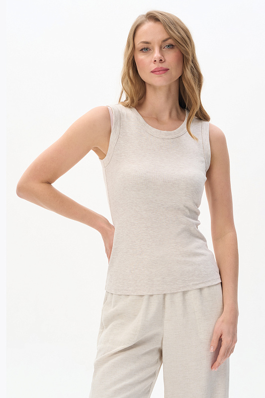 Базовая майка из меланжевой рибаны качества ринг 220 гр в светло-бежевом оттенке. Актуальная модель с широкой окантовкой. Сочетание майки с другими моделями коллекции в том же оттенке, позволяет создавать трендовые монохромные образы. Рост модели 175 см