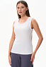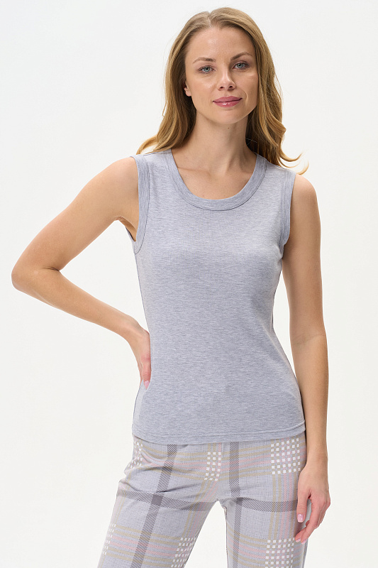 Топ выполнен из хлопкового меланжевого трикотажного полотна с эластаном - рибана. Модного прилегающего силуэта. Круглый вырез горловины и завышенные проймы обработаны широкой планкой. Рост модели на фото 177см.