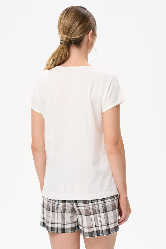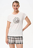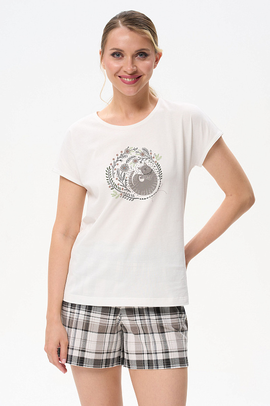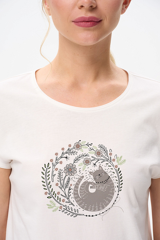 Футболка с принтом из хлопкового полотна качества пенье. Круглый вырез горловины, цельнокроеные короткие рукава. Рост модели на фото 175 см.