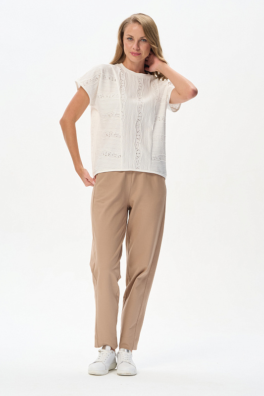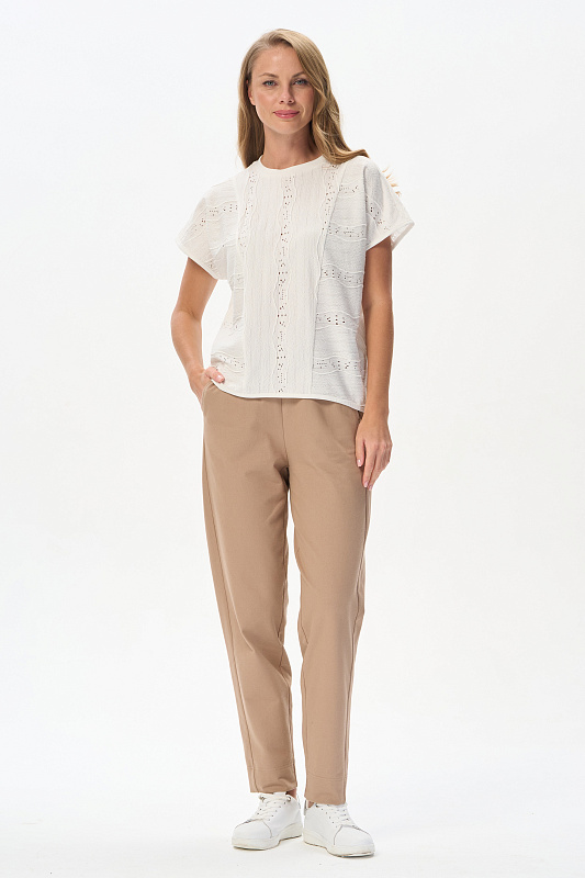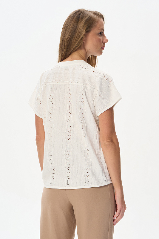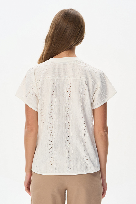Джемпер новой формы из хлопкового жаккарда 175 гр в Молочном оттенке. Модель свободная, со спущенной линией плеча, цельнокроеные короткие рукава, круглый вырез горловины из рибаны. Прекрасная модель для летних образов. Трендовая ажурная фактура выглядит эффектно и сделает ваш образ нарядным. Рост модели 175 см