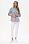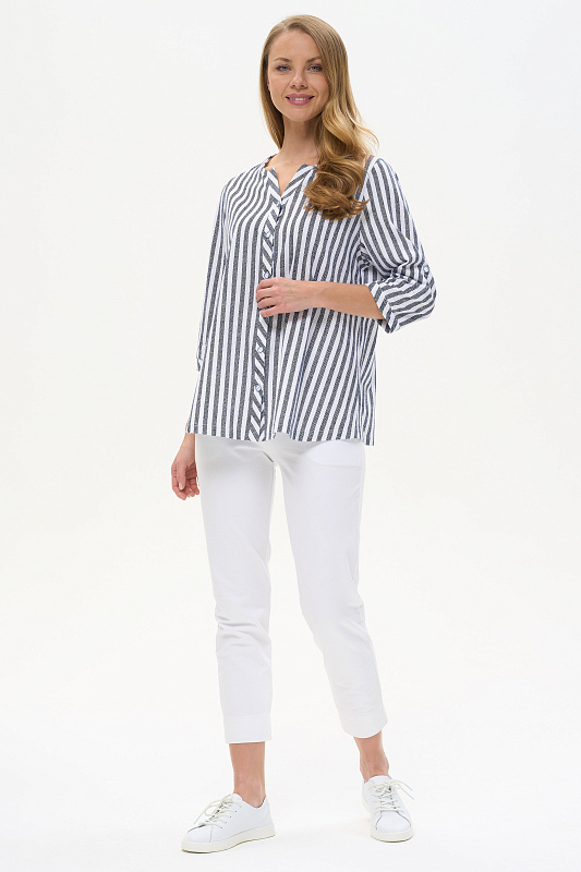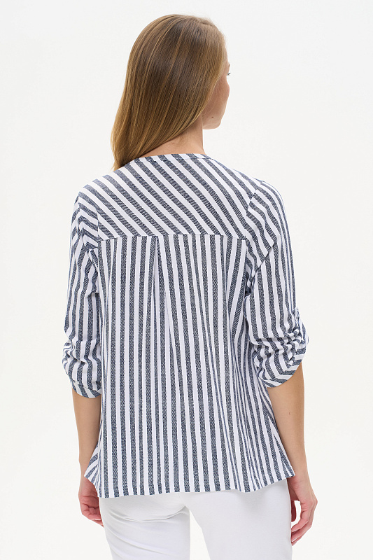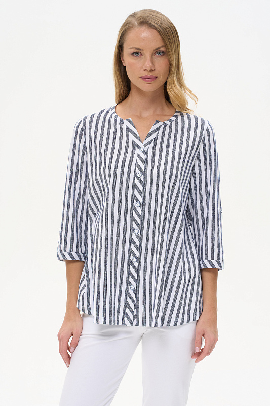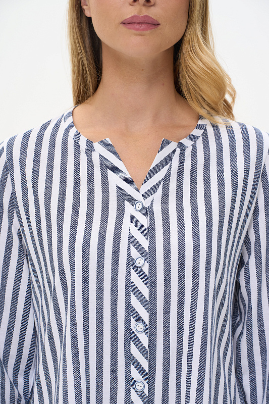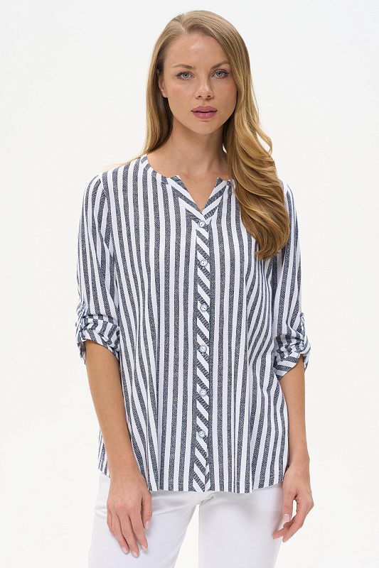 Блузка из кулирка качества ПЕ 150 гр рисунок - вертикальные диагональные полоски в оттенках Глубокий синий и Чистый белый. Модель свободная, прямого силуэта, круглый вырез горловины обработан бейкой, фигурная планка с застёжкой на пуговицы. Рукава свободные, длиной 3/4, паты на рукавах фиксируются пуговицей и красиво оформляют низ рукавов. Лёгкая, комфортная блузка для лета. Рост модели 175 см