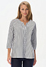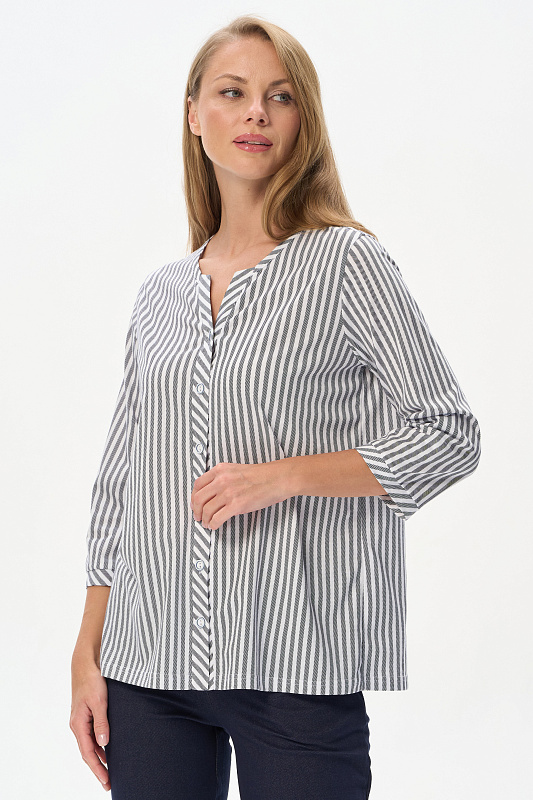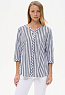Блузка из кулирка качества ПЕ 150 гр рисунок - вертикальные диагональные полоски в оттенках Тёмный сапфир и Чистый белый. Модель свободная, прямого силуэта, круглый вырез горловины обработан бейкой, фигурная планка с застёжкой на пуговицы. Рукава свободные, длиной 3/4, паты на рукавах фиксируются пуговицей и красиво оформляют низ рукавов. Лёгкая, комфортная блузка для лета. Рост модели 175 см.