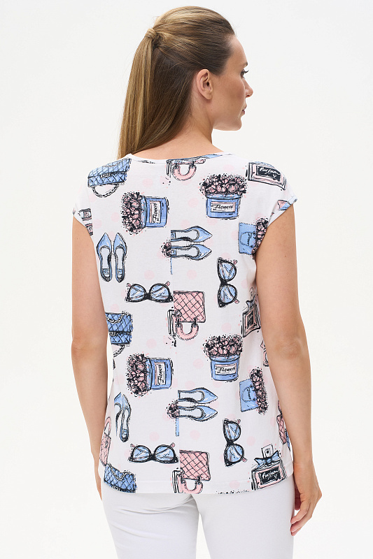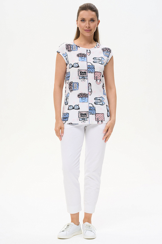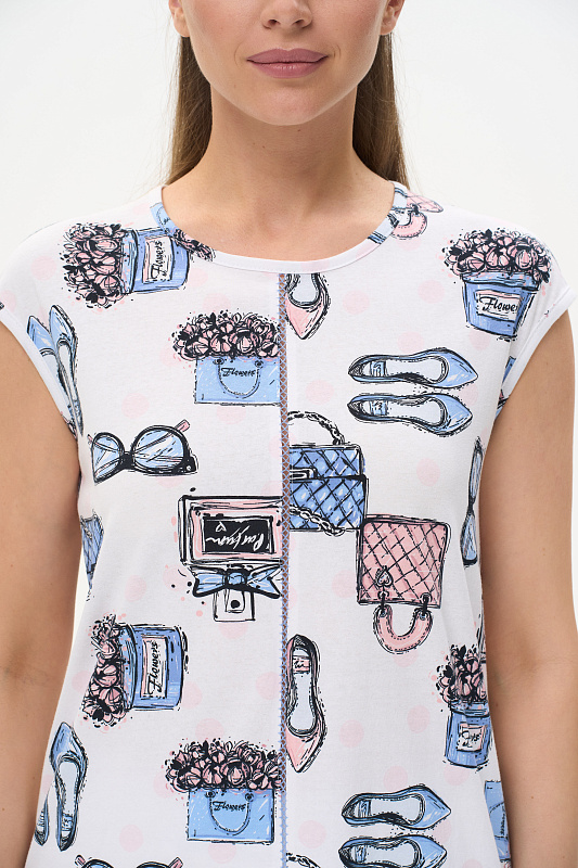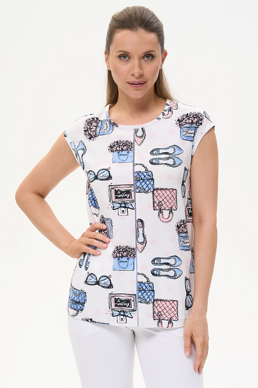 Футболка выполнена из хлопкового трикотажного полотна. Средний шов полочки декорирован мережкой. Модель с круглой горловиной и цельнокроеным коротким рукавом. Рост модели на фото 177см.
