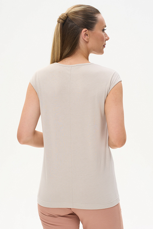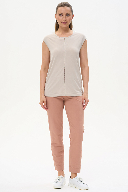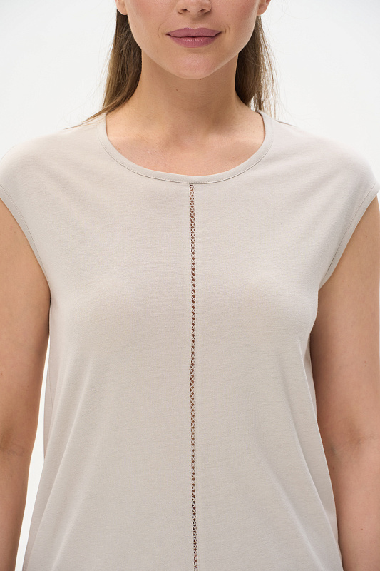 Футболка выполнена из хлопкового трикотажного полотна. Средний шов полочки декорирован мережкой. Модель с круглой горловиной и цельнокроеным коротким рукавом. Рост модели на фото 177см.