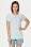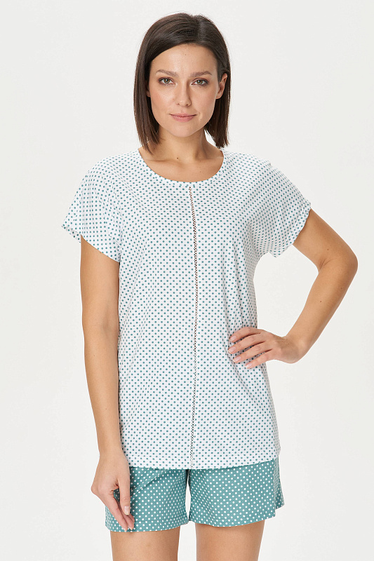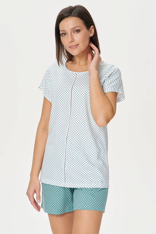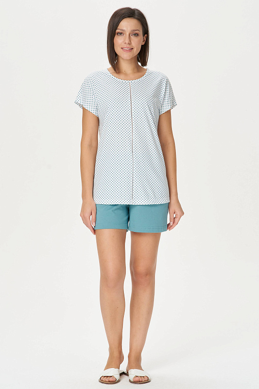Футболка выполнена из хлопкового трикотажного полотна и декорирована мережкой. Модель с округлой горловиной и цельнокроеным коротким рукавом. Рост модели на фото 170см.