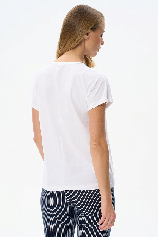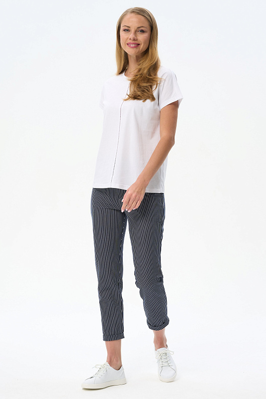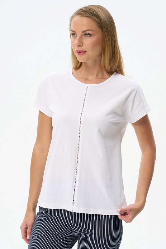 Футболка выполнена из хлопкового трикотажного полотна и декорирована мережкой. Модель с округлой горловиной и цельнокроеным коротким рукавом. Рост модели на фото 178см.