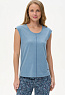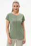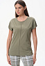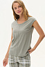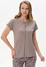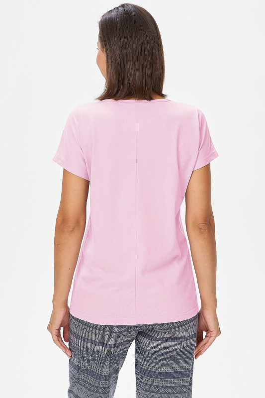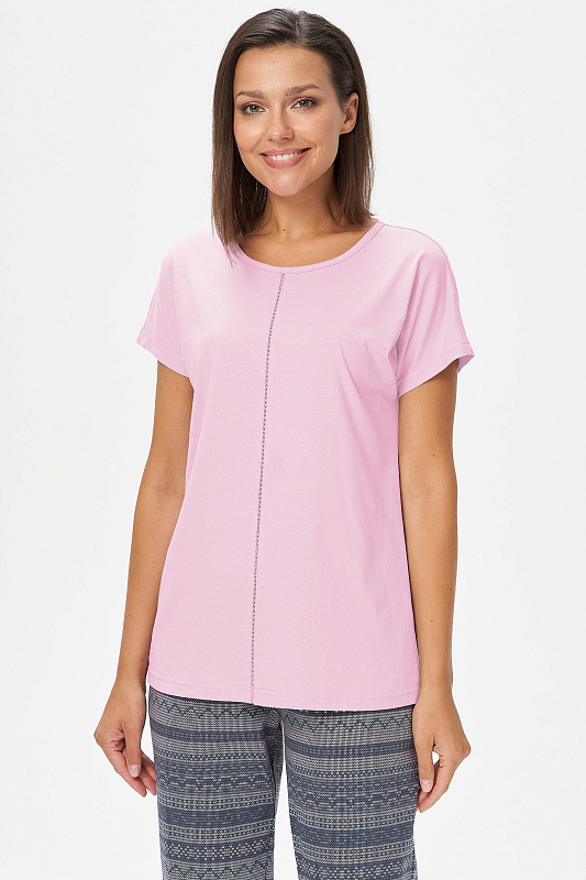 Футболка выполнена из хлопкового трикотажного полотна и декорирована мережкой. Модель с округлой горловиной и цельнокроеным коротким рукавом. Рост модели на фото 170см.