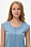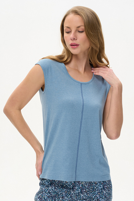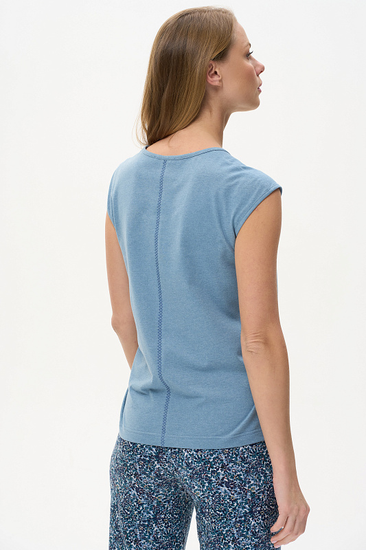 Футболка выполнена из хлопкового меланжевого трикотажного полотна. Средние швы полочки и спинки декорированы мережкой. Модель с круглой горловиной и цельнокроеным коротким рукавом. Рост модели на фото 178 см.