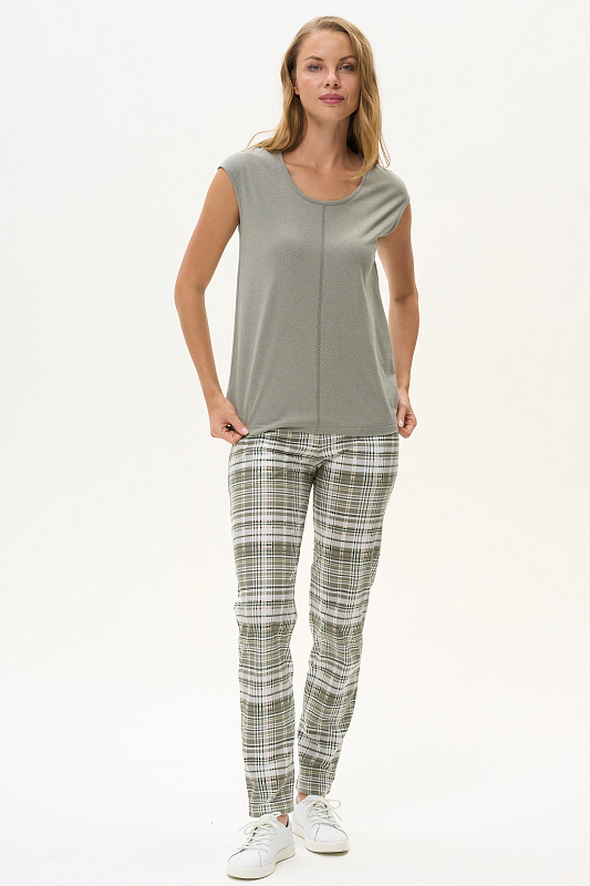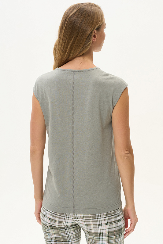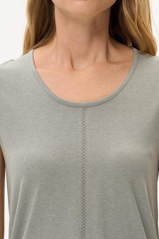 Футболка выполнена из хлопкового меланжевого трикотажного полотна. Средние швы полочки и спинки декорированы мережкой. Модель с круглой горловиной и цельнокроеным коротким рукавом. Рост модели на фото 178см.