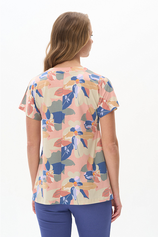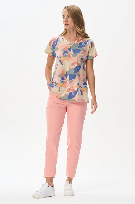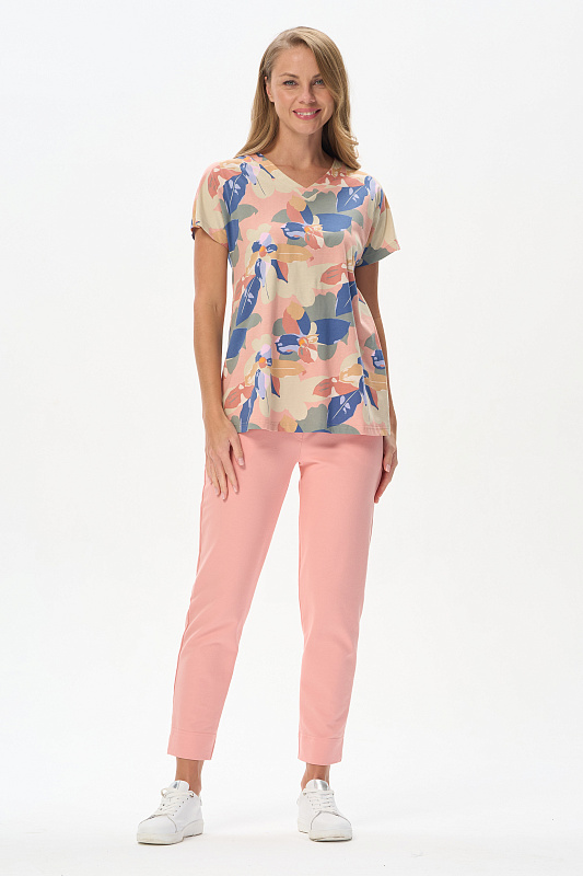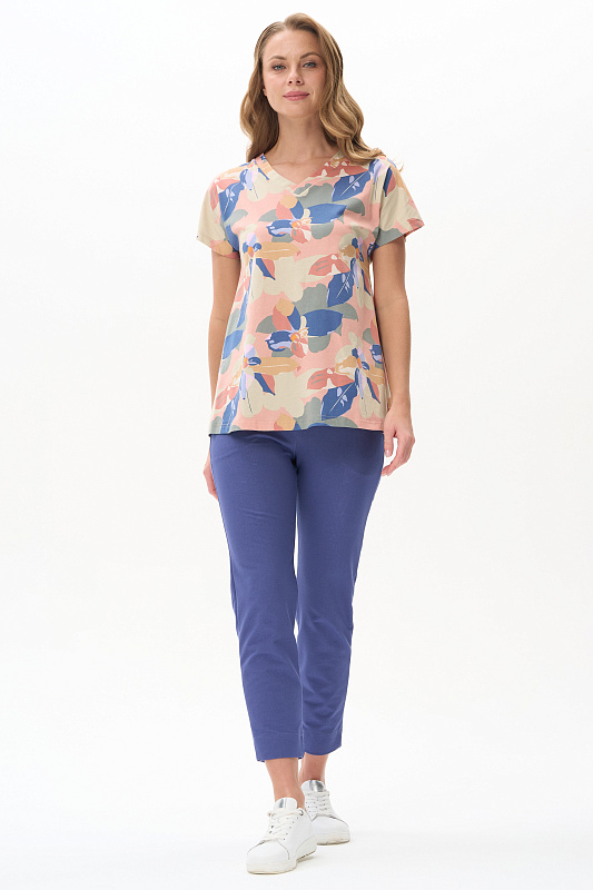 Свободная футболка из хлопкового трикотажного полотна. V-образный вырез горловины оформлен планкой, короткие цельнокроенные рукава. Рост модели на фото 175.