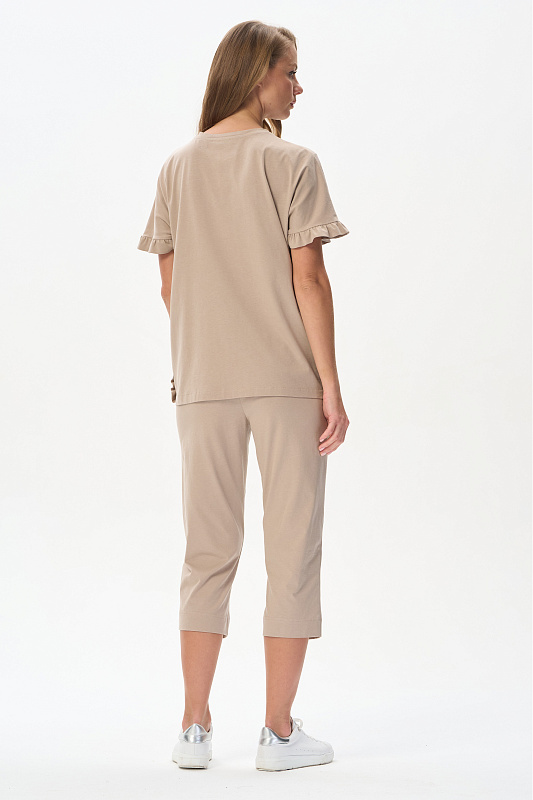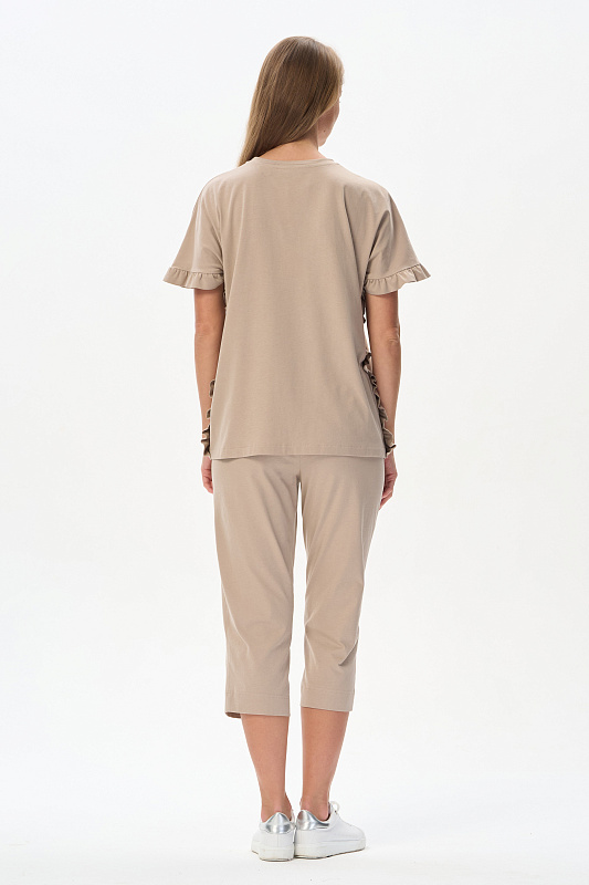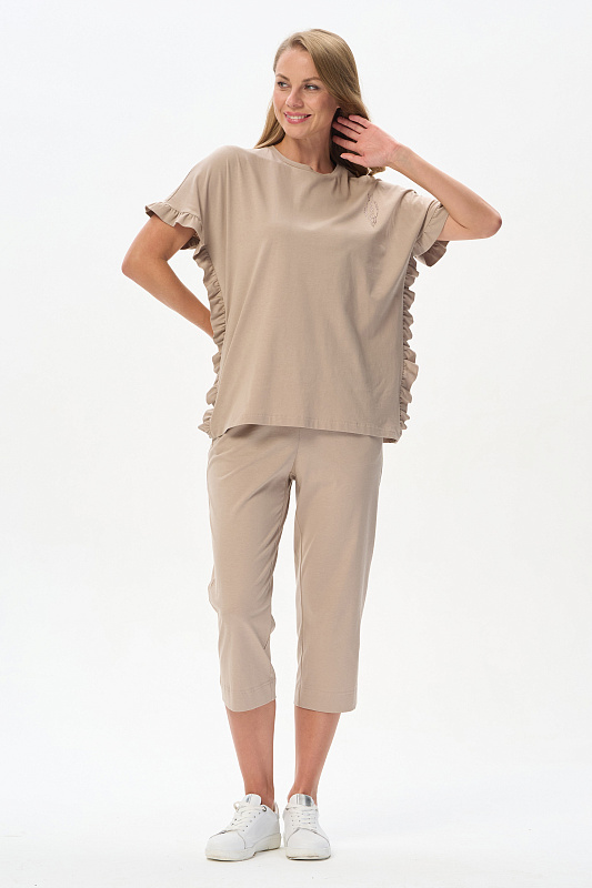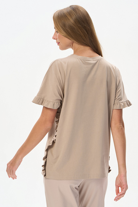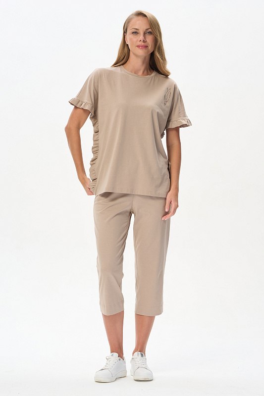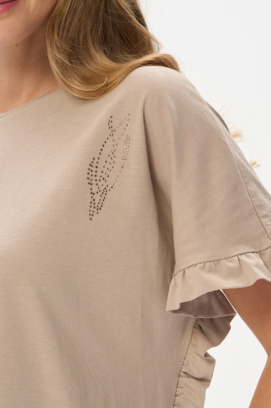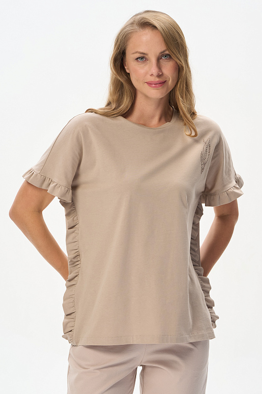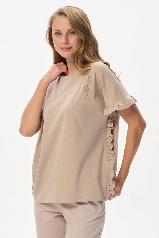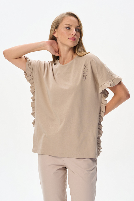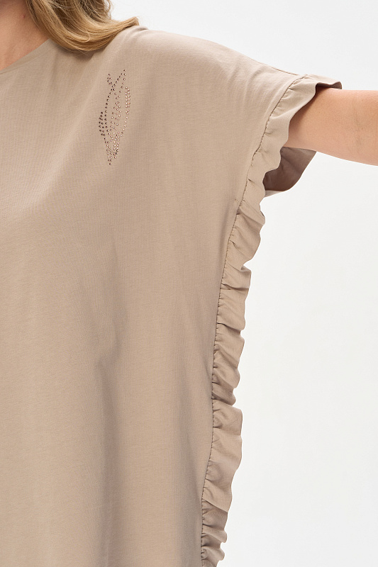 Футболка из кулирки 150 гр в оттенке Дюны. Модель новой формы, свободная, удлинённая, круглая горловина, спущенное плечо, по краю рукавов и бокам рюша. Слева на полочке красивая аппликация из мерцающих страз. Интресная новинка для летних образов. Рост модели 175 см.