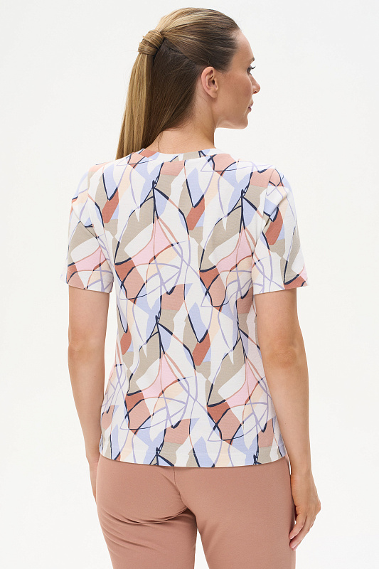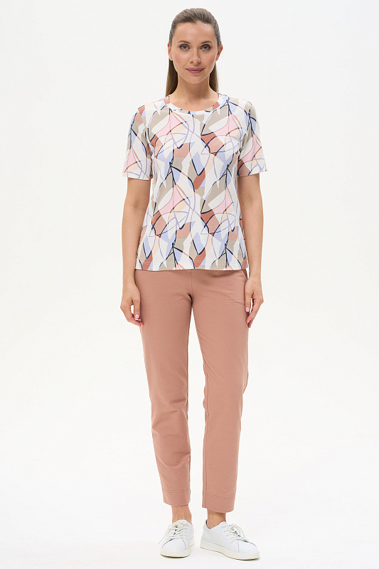 Стильная футболка прямого силуэта, выполнена из хлопкового трикотажного полотна с эластаном - рибана. Круглый вырез горловины, втачные короткие рукава. Рост модели 175 см.