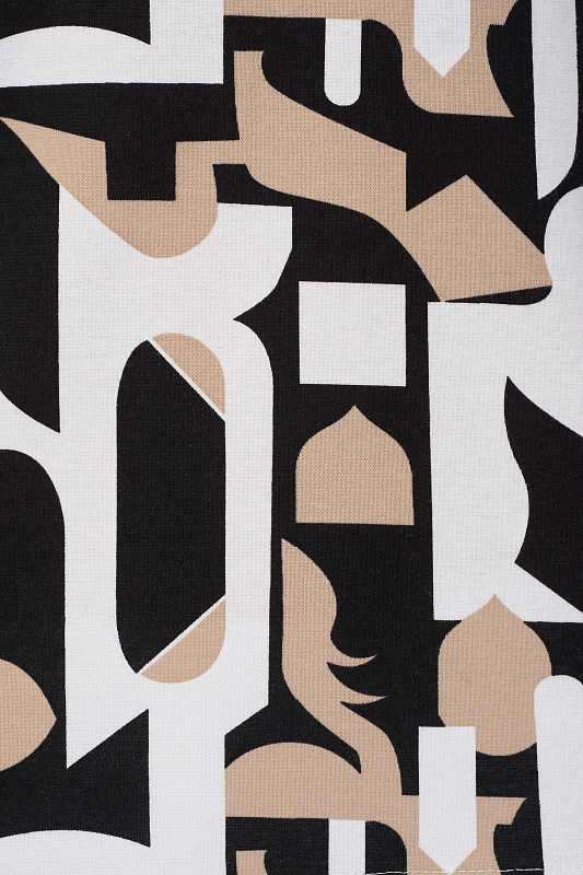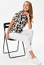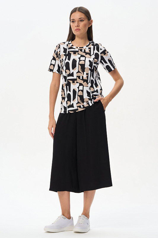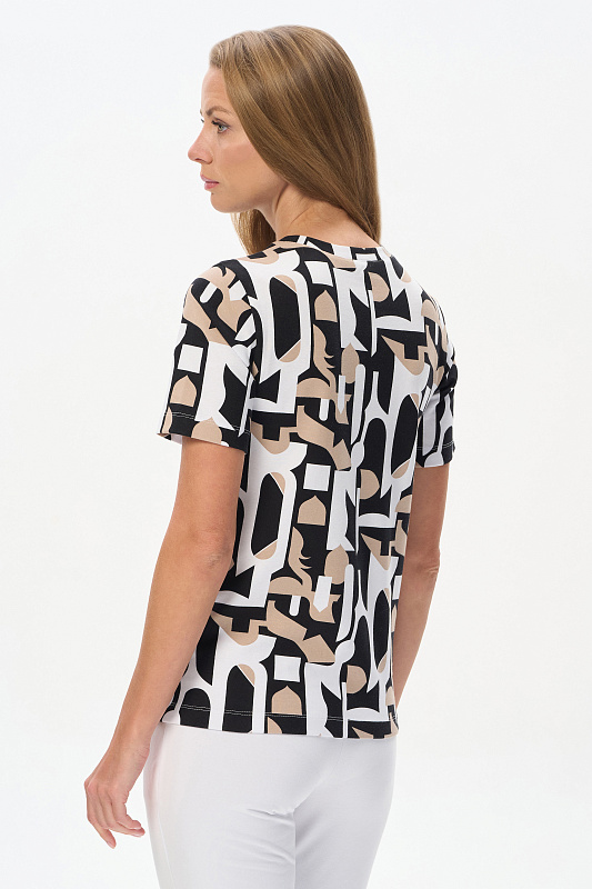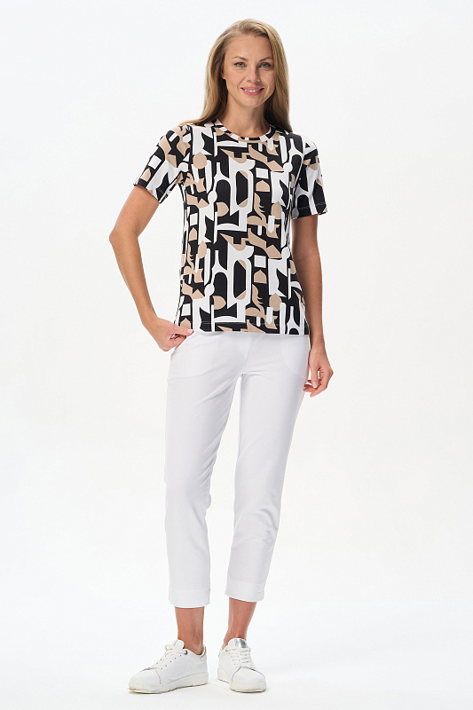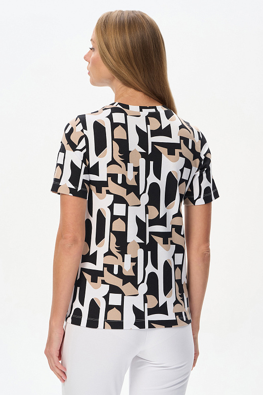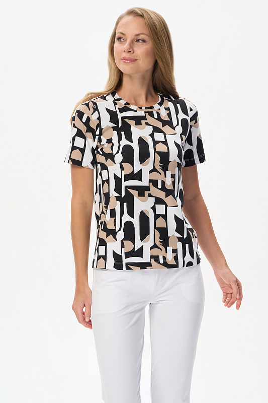 Футболка выполнена из пластичной рибаны с дизайнерским рисункоми. Модель прямого силуэта, круглый углубленный вырез, рукава втачные. Комфортная модель для повседневных образов с брюками и юбкой. Рост модели 175 см.