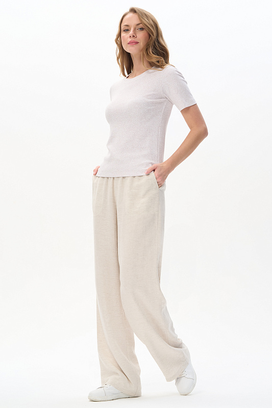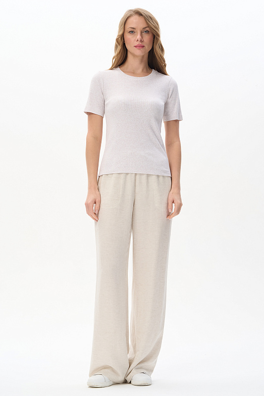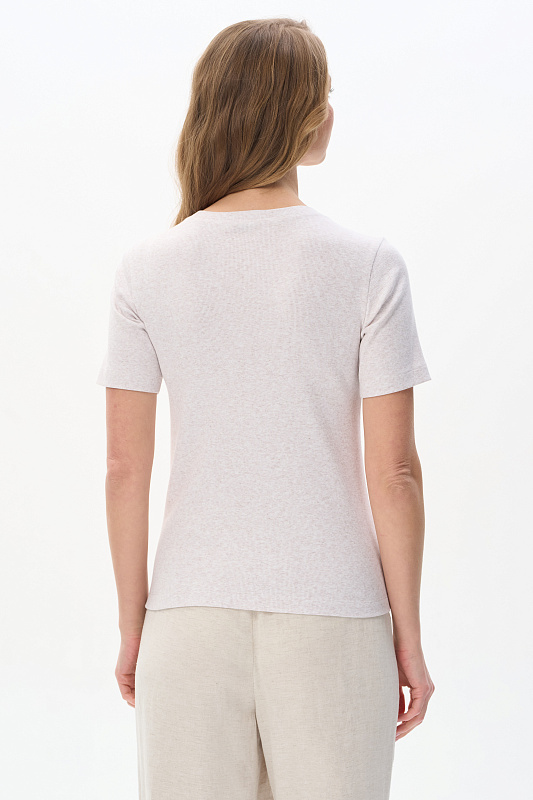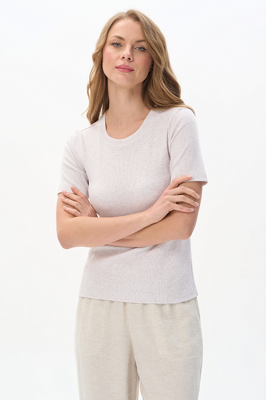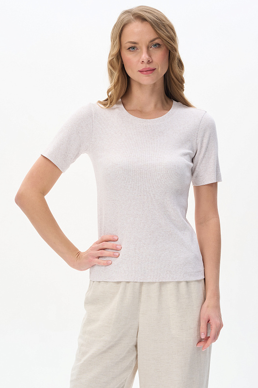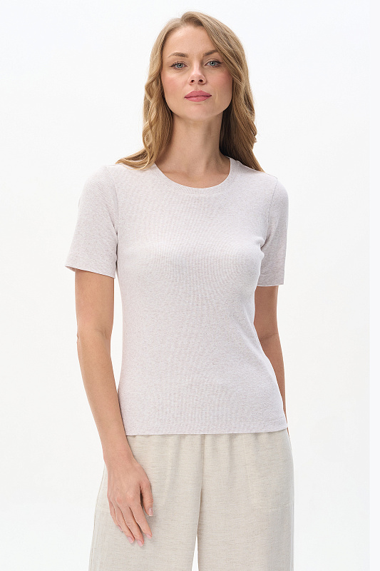 Базовая футболка из меланжевого кашкорсе качества пенье 240 гр в светло-бежевом оттенке оттенке. Актуальная приталенная модель с широкой окантовкой по горловине, короткие базовые рукава. Идеально сочетается с жакетами, брюками, шортами. Позволяет создавать трендовые образы. Рост модели 175 см