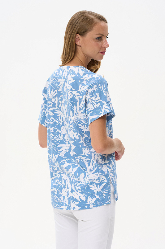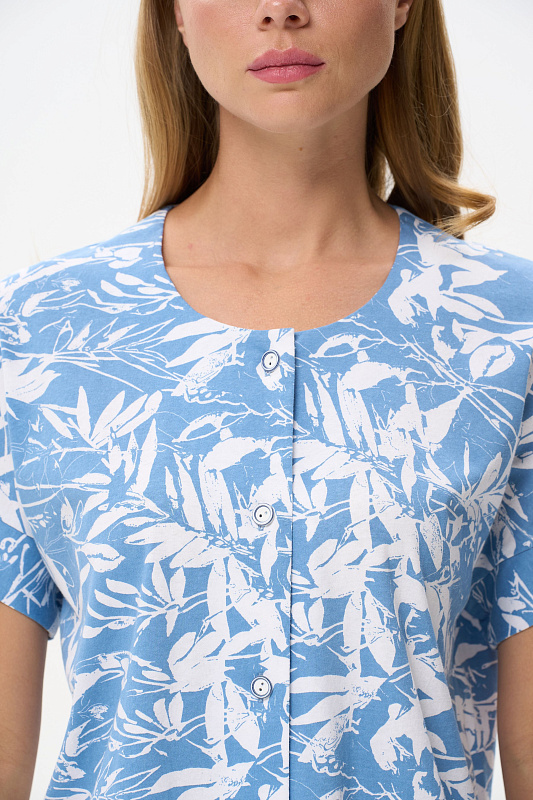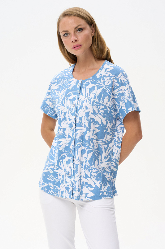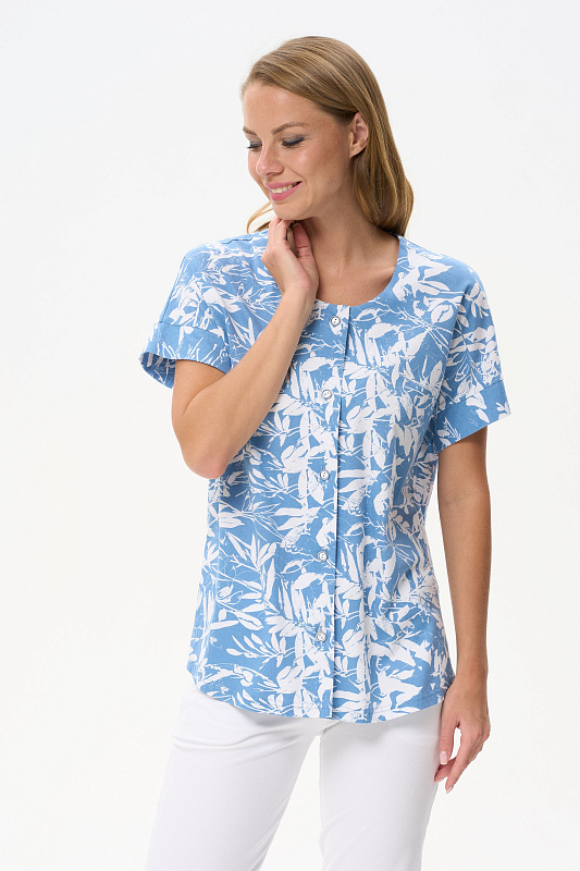 Блузка свободного силуэта из хлопкового трикотажного полотна. Застёжка на пуговицы, круглый вырез горловины, цельнокроеные рукава с притачными манжетами. Рост модели на фото 177см.