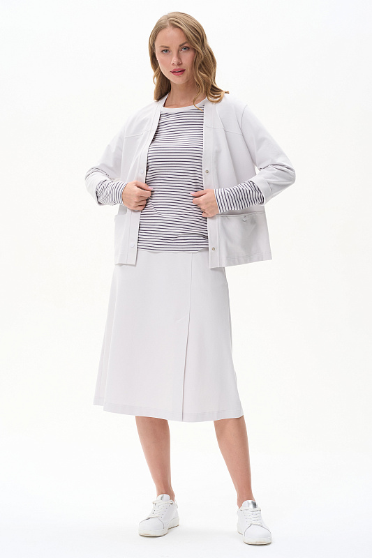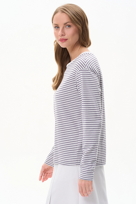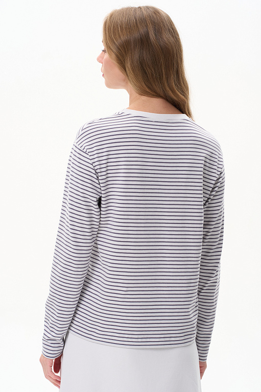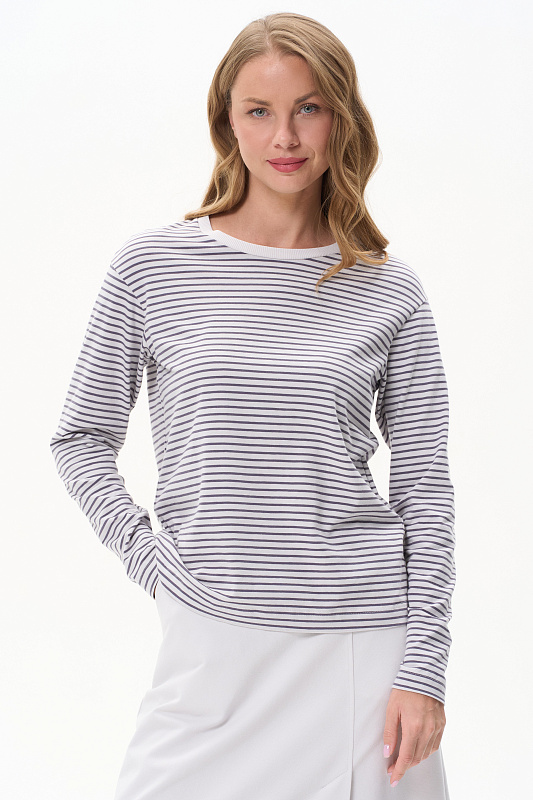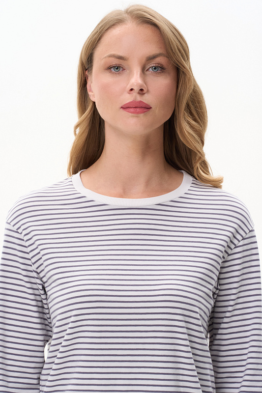 Повседневный базовый джемпер в полоску из хлопкового полотна с эластаном качества пенье 180 гр. Модель с круглым вырезом горловины и длинными втачными рукавами. Комфортная, универсальная модель в трендовых оттенках: Жемчужный и Утренний туман. Рост модели 175 см
