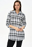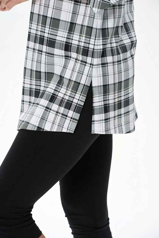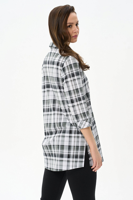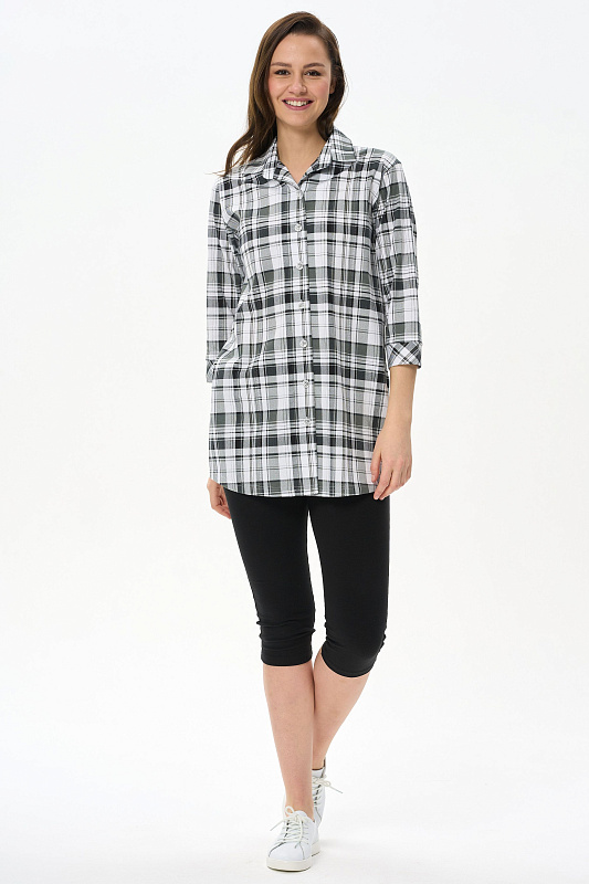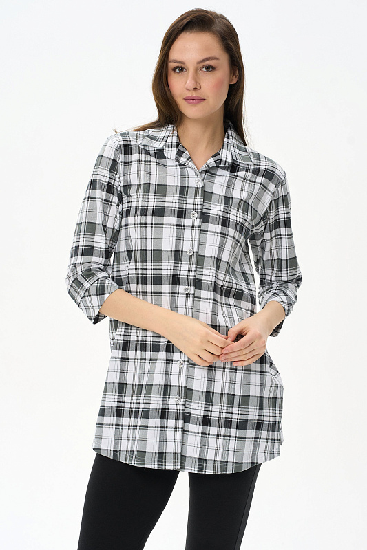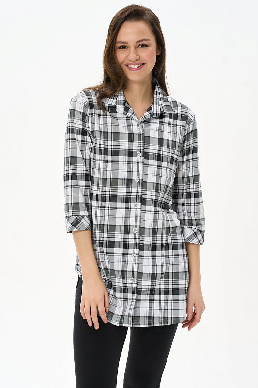 Удлиненная рубашка из хлопкового трикотажного полотна. Сквозная застёжка на пуговицы и отложной воротник. Втачные рукава длинной 3/4 с притачной манжетой. По низу изделия в боковых швах разрезы. Рост модели на фото 178 см