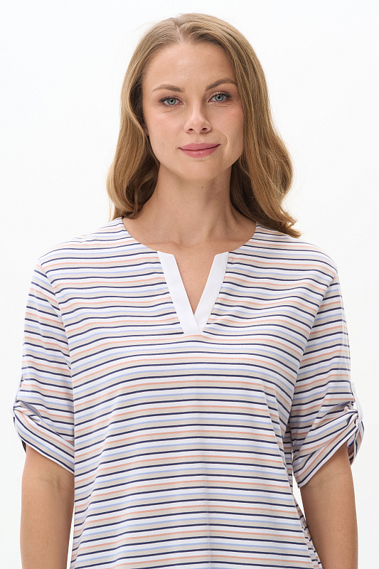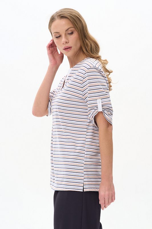 Футболка из хлопкового трикотажного полотна с разрезами по бокам. Втачной рукав с патой. Рост модели 175 см.