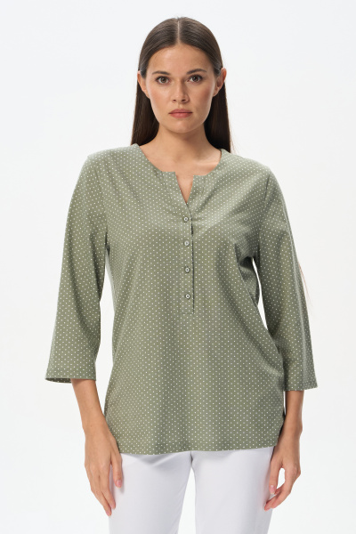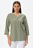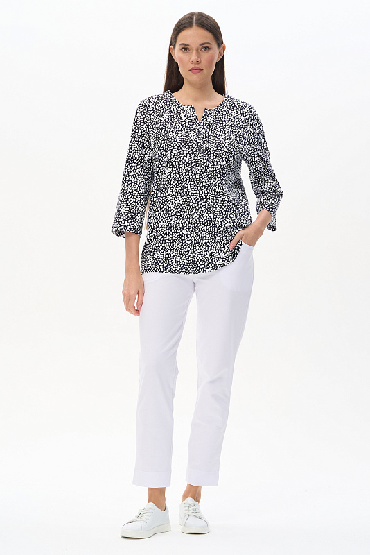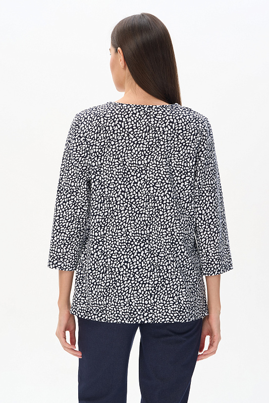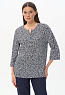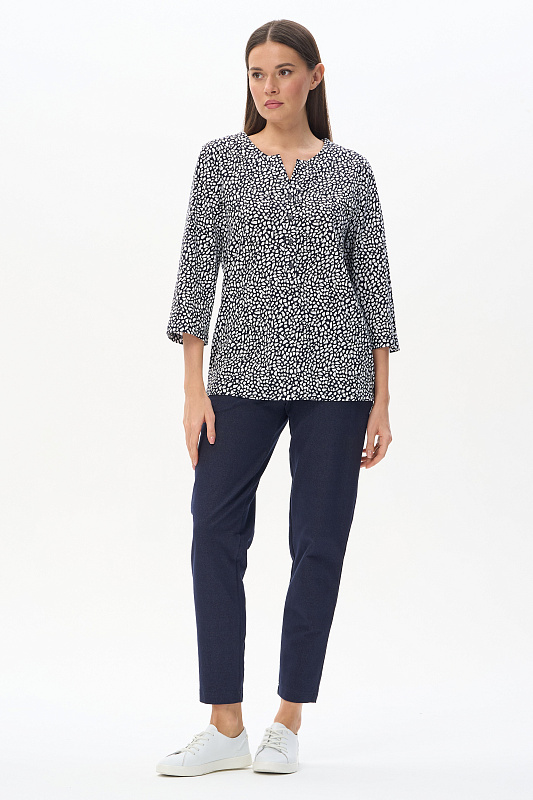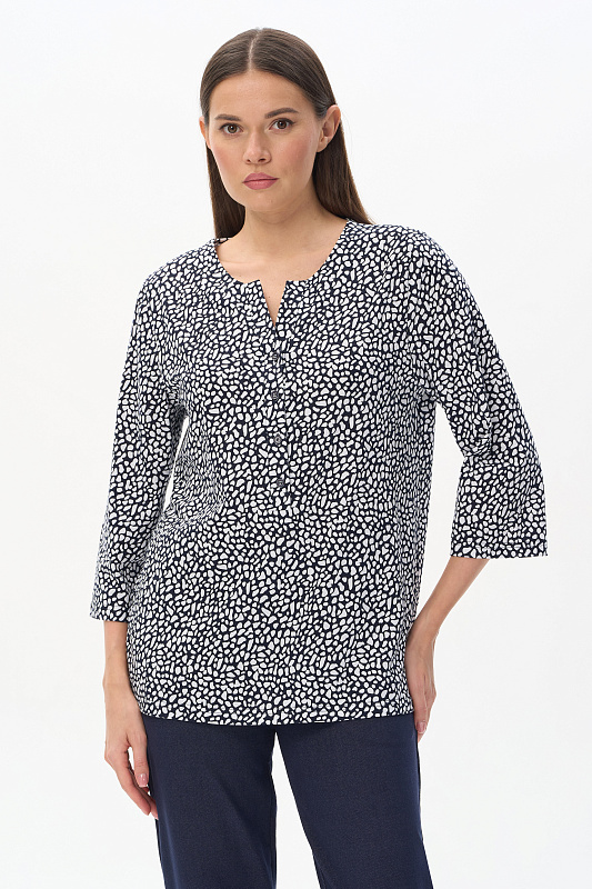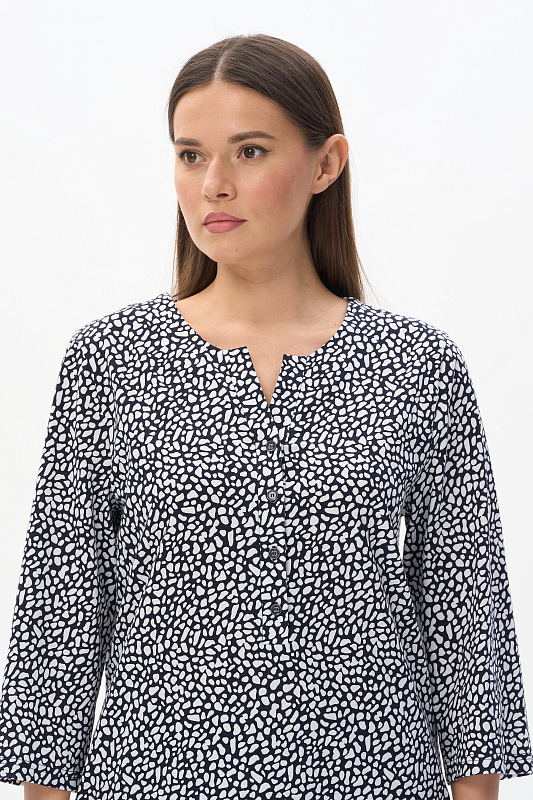 Блузка из кулирки качества ПЕ 150 гр белая графика на глубоком синем. Модель свободная, прямого силуэта, планка с застёжкой на пуговицы, втачной рукав длиной 3/4. Комфортный выбор для дома и отдыха. Рост модели 175 см.