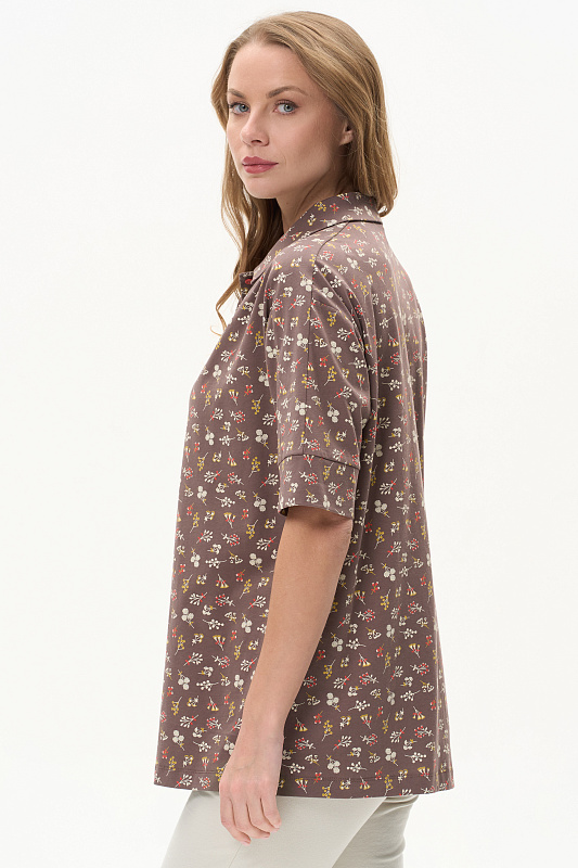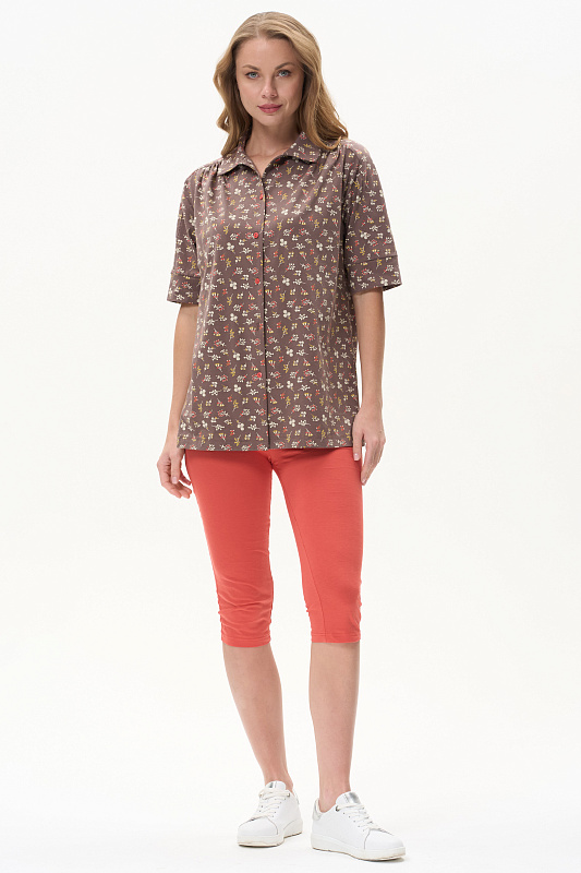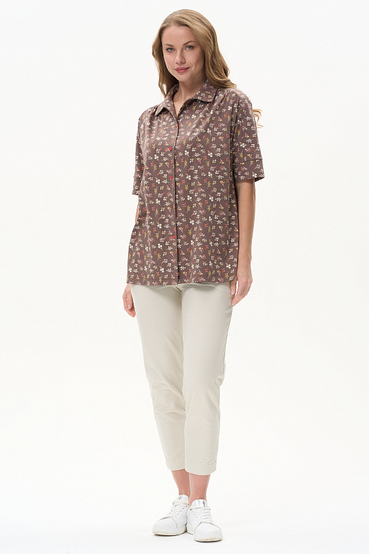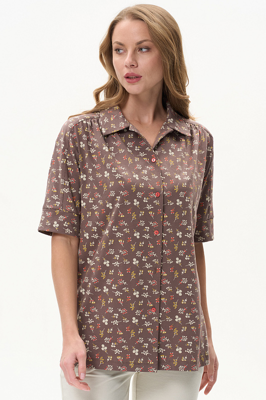 Блузка из кулирки качества ПЕ 150 гр. Модель свободная прямого силуэта, по плечу и рукаву вставка, на полочке небольшая сборка, отложной воротник, застежка на пуговицы, втачные рукава длиной до локтя по низу оформлены манжетой. Прекрасная модель на любой случай, подходит для города, дома и отдыха. Рост модели 175 см.