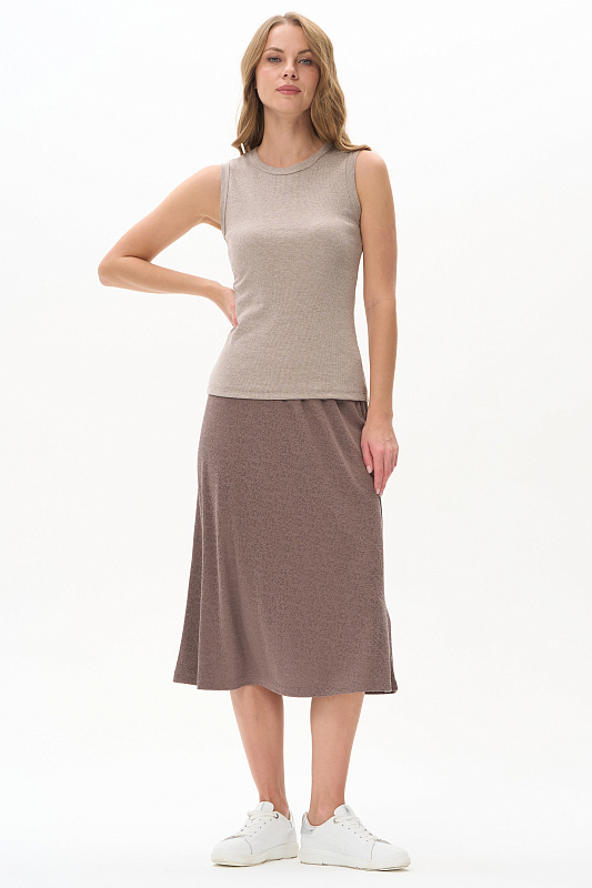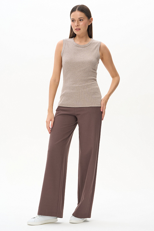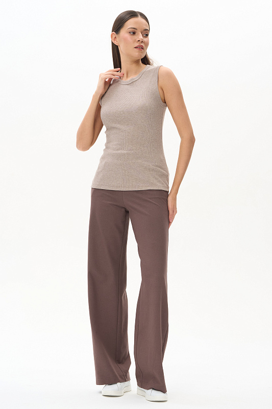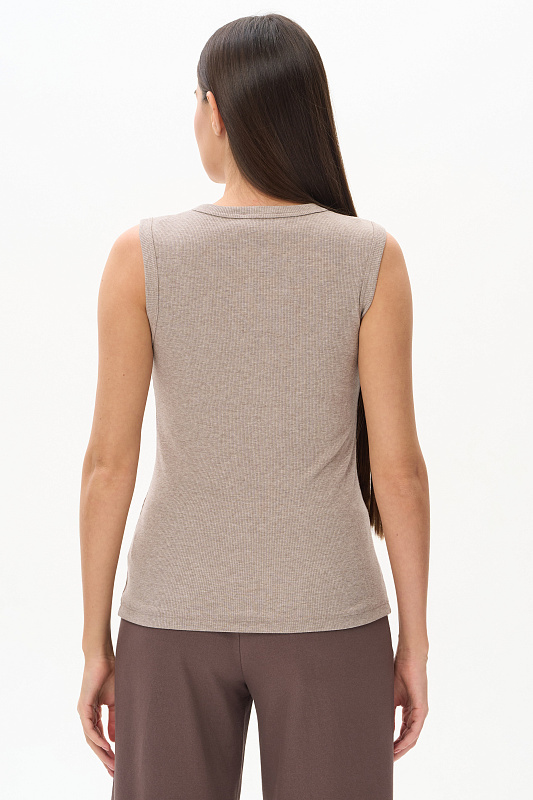Базовая майка из меланжевого кашкорсе качества пенье 240 гр в бежевом оттенке. Актуальная приталенная модель с широкой окантовкой. Идеально сочетается с жакетами, брюками, шортами. Позволяет создавать трендовые образы. Рост модели 175 см.