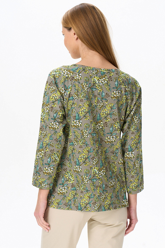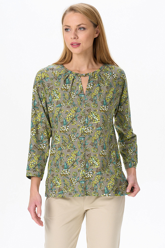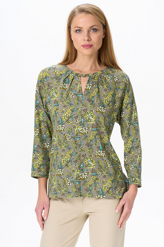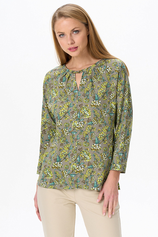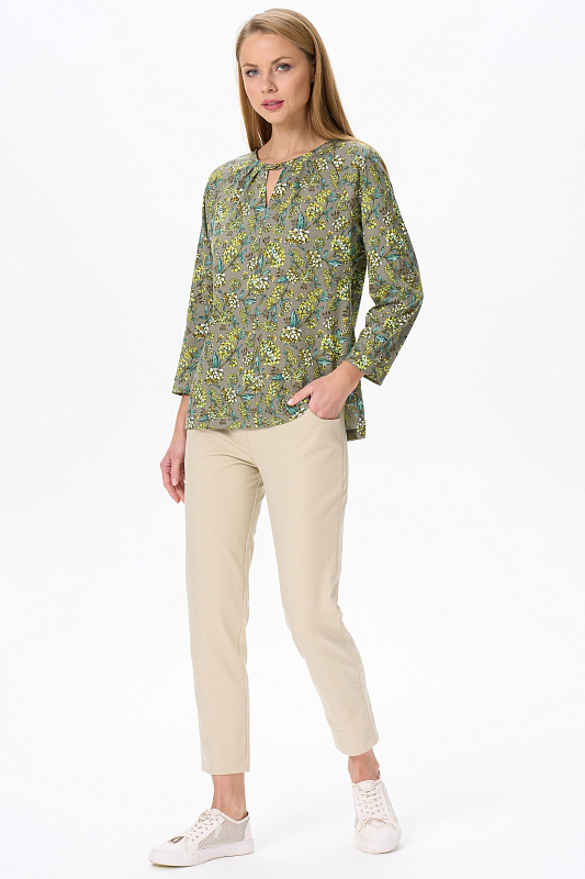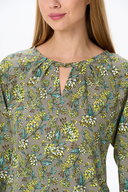 Повседневная блузка, приталенного силуэта, из хлопкового трикотажного полотна. Круглый вырез горловины декорирован складками. Длинные рукава реглан с притачной манжетой. По низу боковых швов разрезы. Рост модели на фото 177.