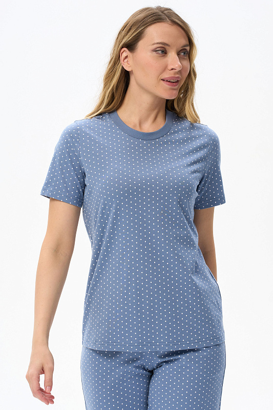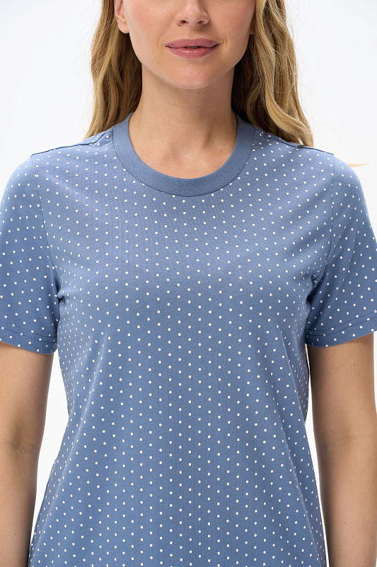 Футболка модного кроя - свободная и чуть укороченная, до середины бёдер. Выполнена из хлопкового трикотажного полотна. Вырез горловины обработан хлопковым полотном - рибана. Свободный втачной рукав гармонизирует общий стиль. Рост модели на фото 175 см