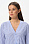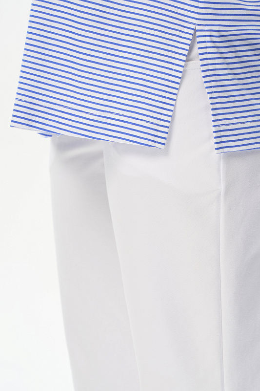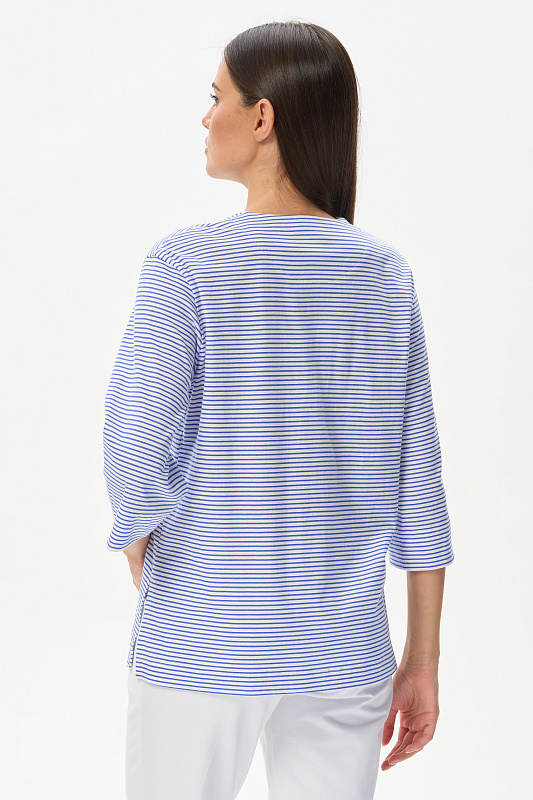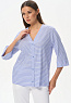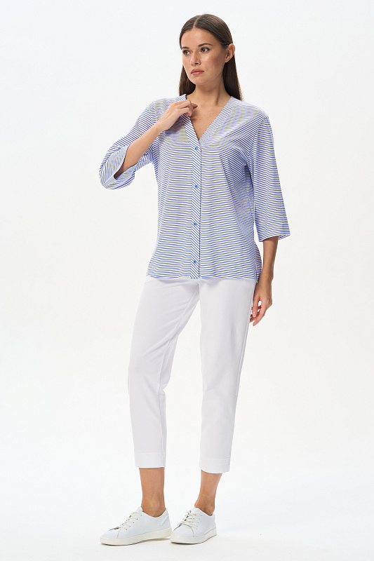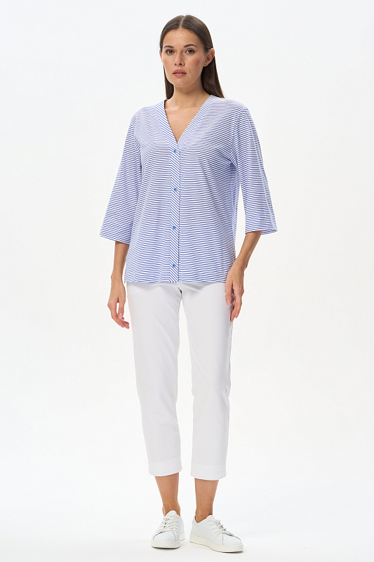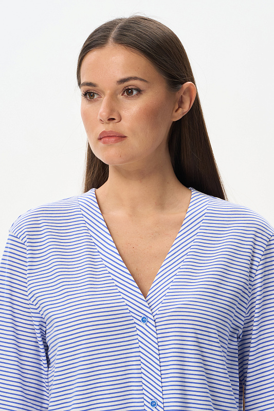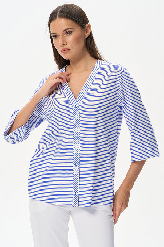 Блузка из кулирка качества ПЕ 150 гр рисунок - полоски в оттенках Яркий синий и Чистый белый. Модель свободная, прямого силуэта, V-образный вырез горловины и борт обработаны широкой планкой по-косой, застёжка на изящные пуговицы. Рукава свободные, длиной 3/4, с широкими подворотами, которые позволяют регулировать длину рукавов. Лёгкая, комфортная блузка для летнего сезона. Рост модели 175 см.