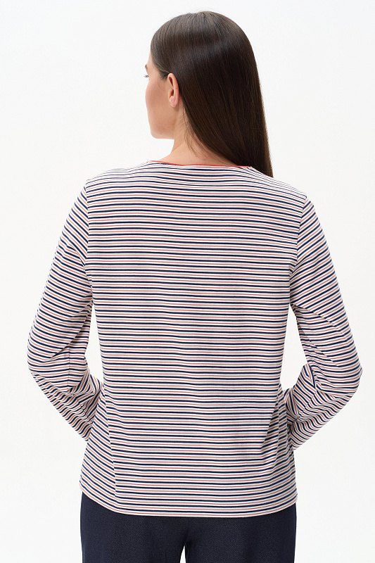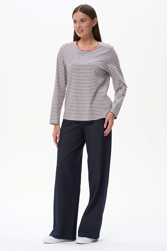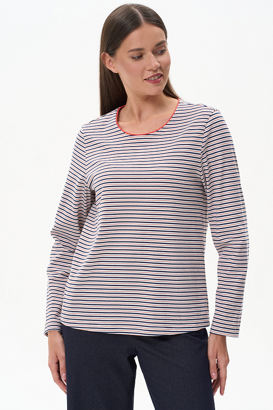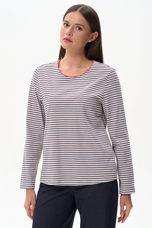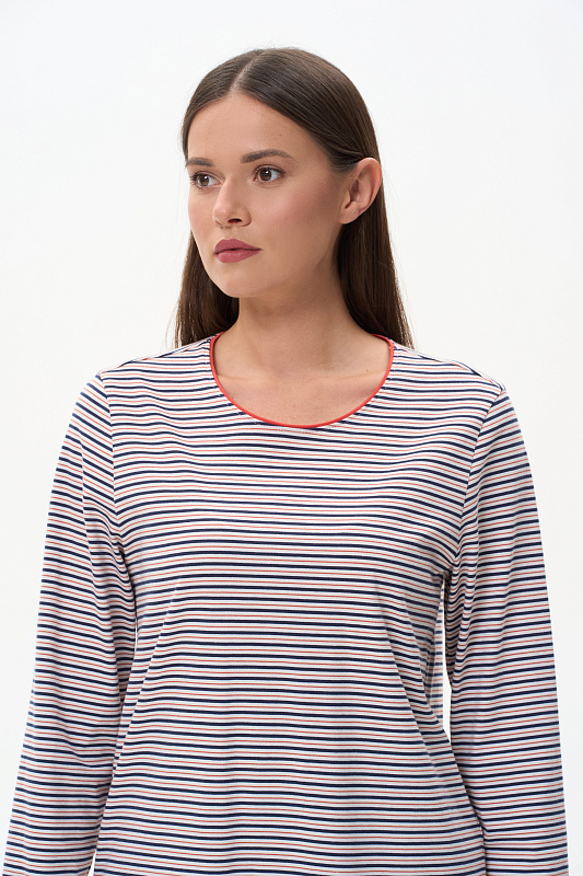 Повседневный базовый джемпер в полоску из хлопкового полотна качества пенье плотностью 186 гр. Модель с круглым вырезом горловины и длинными втачными рукавами. Рост модели 175 см.