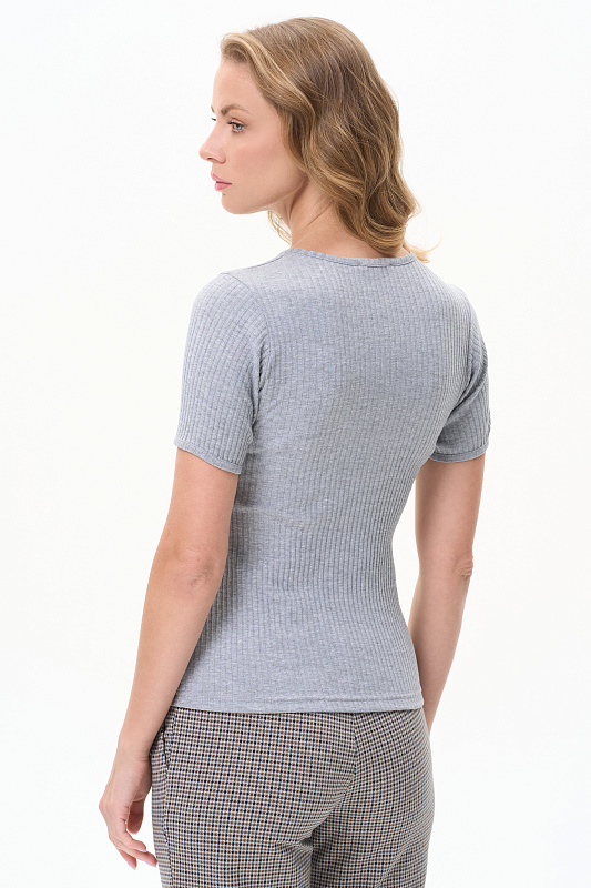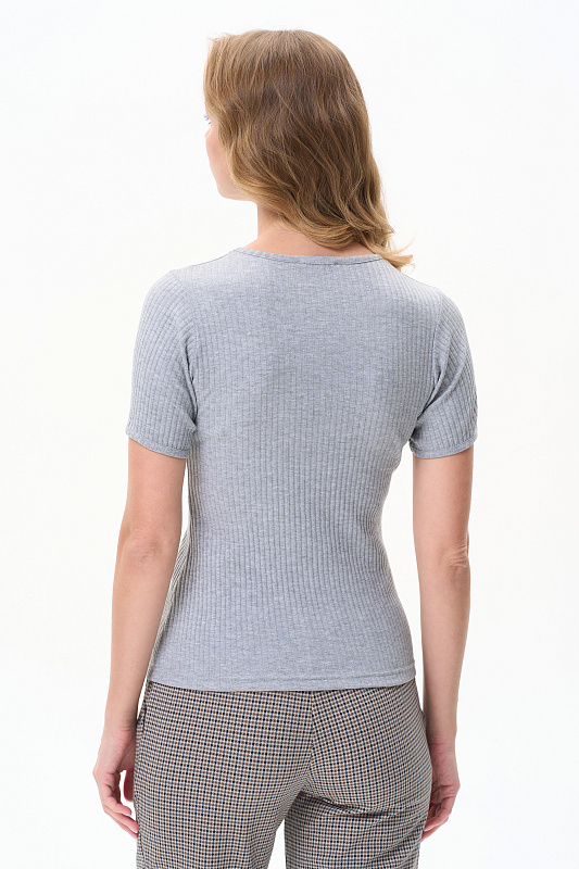 Футболка из фактурного хлопкового трикотажного полотна с эластаном. Круглая форма горловины, короткие втачные рукава. Рост модели 178 см.