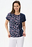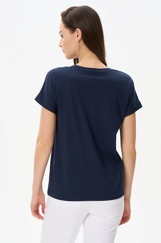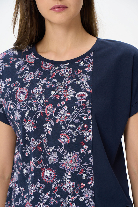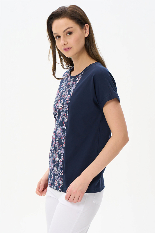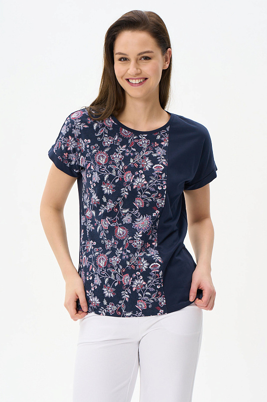 Комбинированная футболка выполнена из хлопкового трикотажного полотна. Круглый вырез горловины, цельнокроенные короткие рукава с манжетами. Рост модели на фото 177.