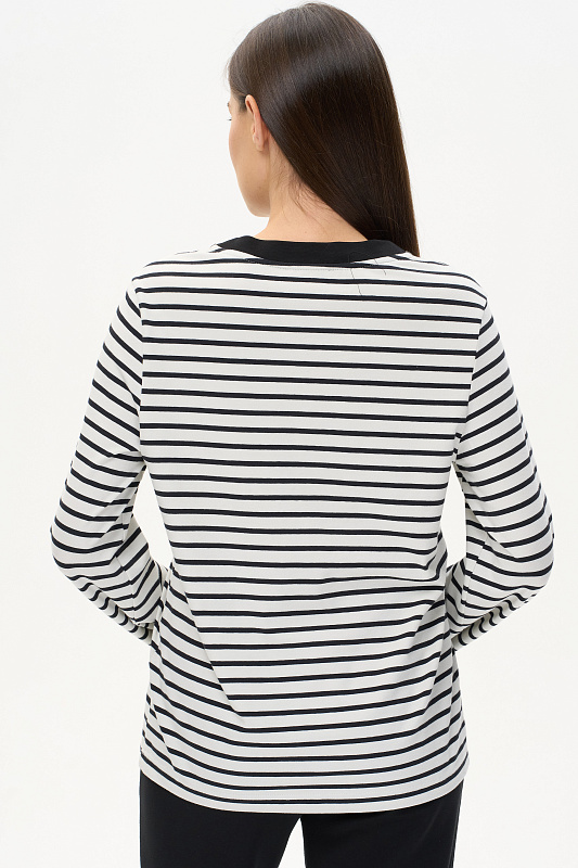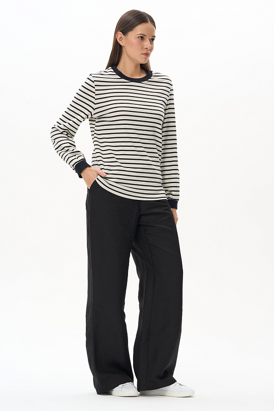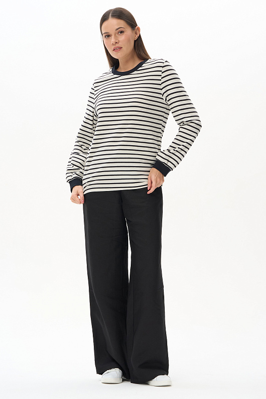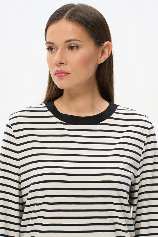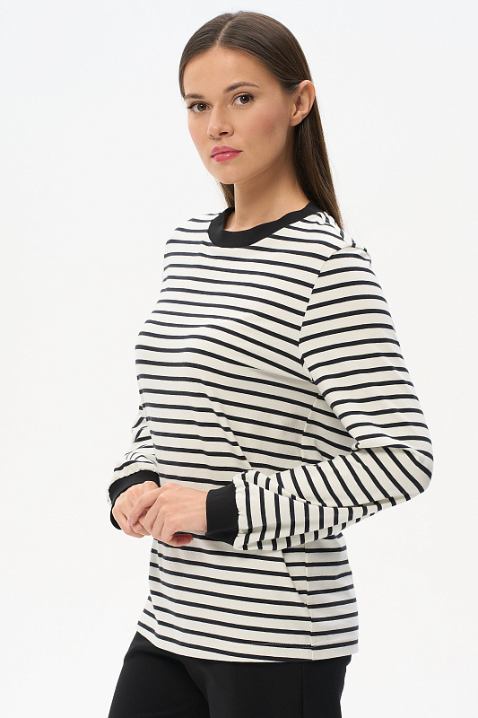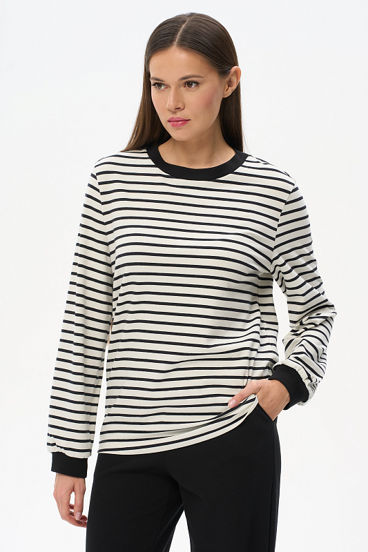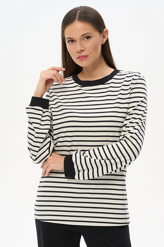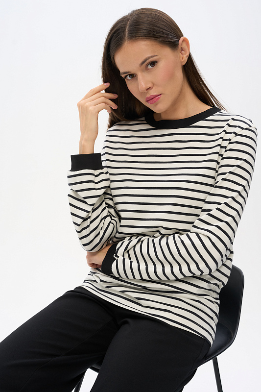 Повседневный базовый джемпер в полоску из хлопкового полотна с эластаном качества пенье 190 гр. Модель свободная, круглый вырез горловины и длинные втачные рукава на манжете с модным напуском. Комфортная, универсальная модель в трендовых оттенках: Молочный и Глубокий чёрный. Рост модели 175 см.