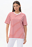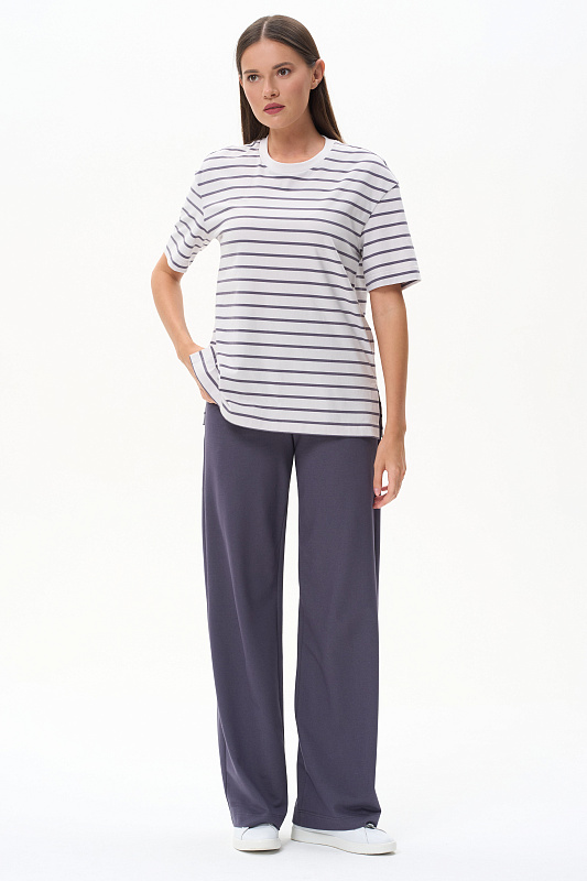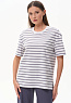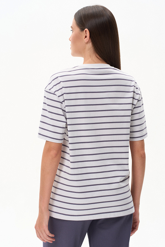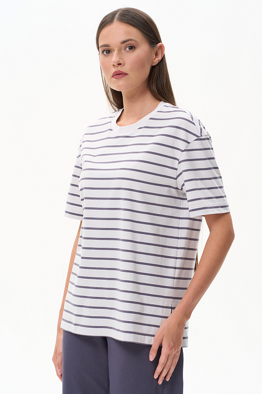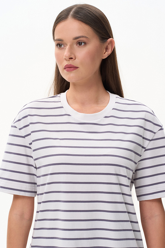 Повседневная базовая футболка в полоску из хлопкового полотна качества пенье 186 гр. Модель удлинённая, с круглым вырезом горловины и рукавами до локтя. Комфортная, универсальная модель в трендовых оттнеках: Жемчужный и Утренний туман. Рост модели 175 см.