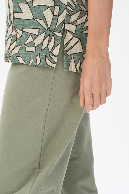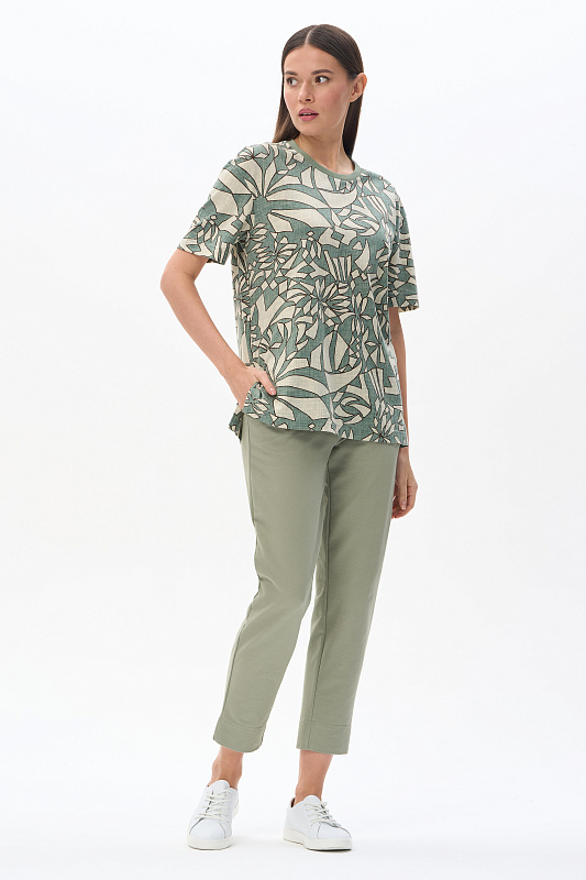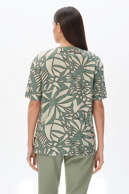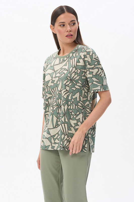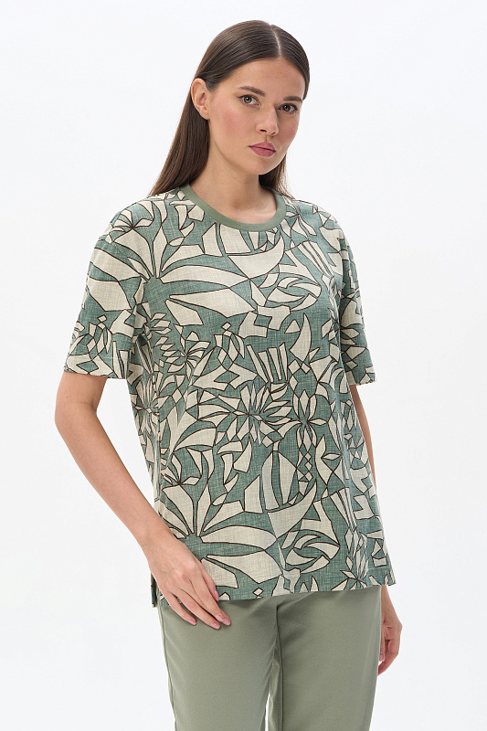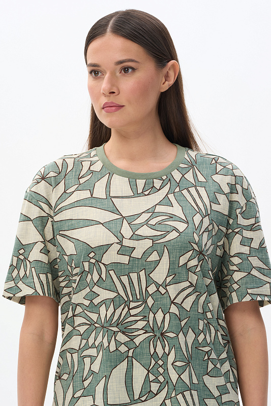 Повседневная базовая футболка из кулирки качества ПЕ 150 гр Абстрактный рисунок в оттенках коллекции. Модель свободная, прямого силуэта, круглый вырез горловины обработан рибаной, рукава широкие, длиной выше локтя, по бокам разрезы. Очень комфортная, универсальная модель для дома и отдыха. Дизайнерский принт полотна выглядит динамично и актуально. Рост модели 175 см.