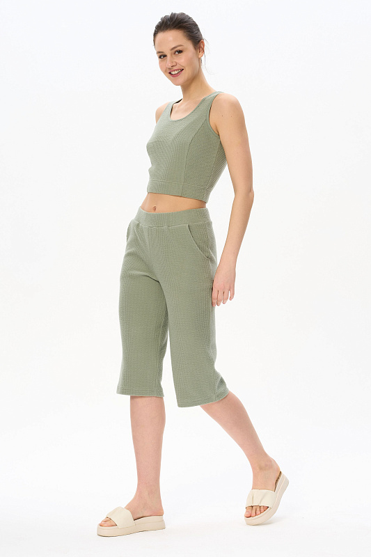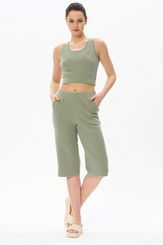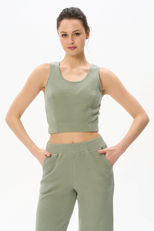 Кроп-топ выполнен из нового хлопкового трикотажного полотна - интерлок жаккард софт. Круглый вырез горловины и проймы окантованы. По низу изделия эластичная тесьма. Рост модели на фото 178см.
