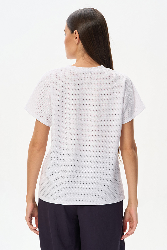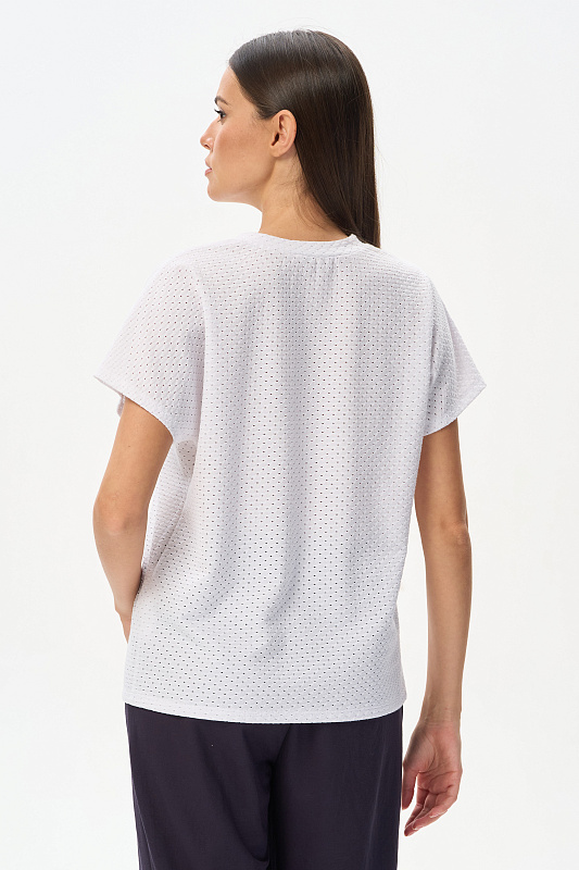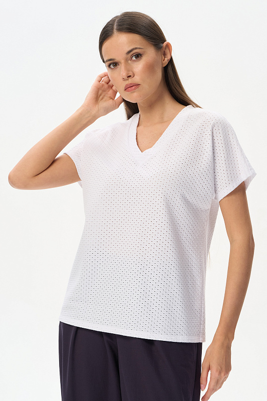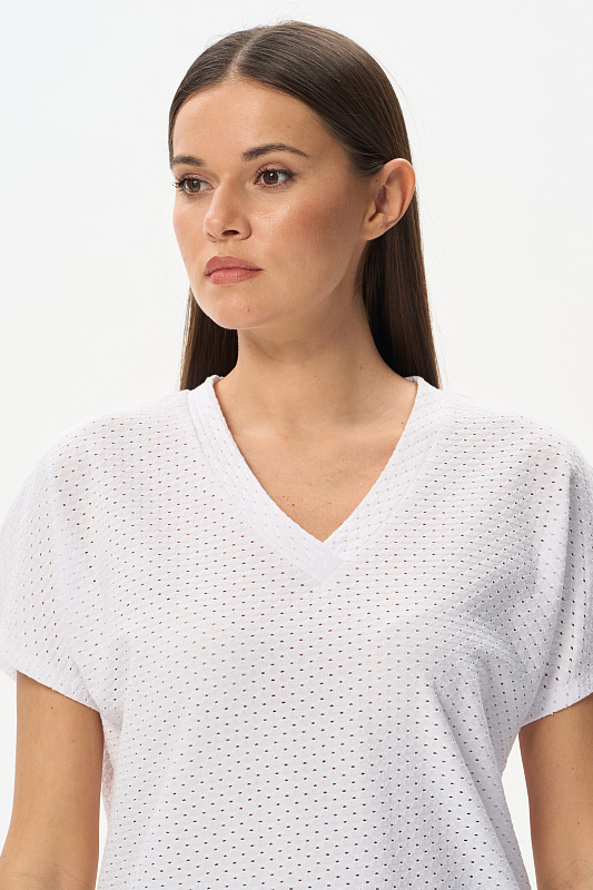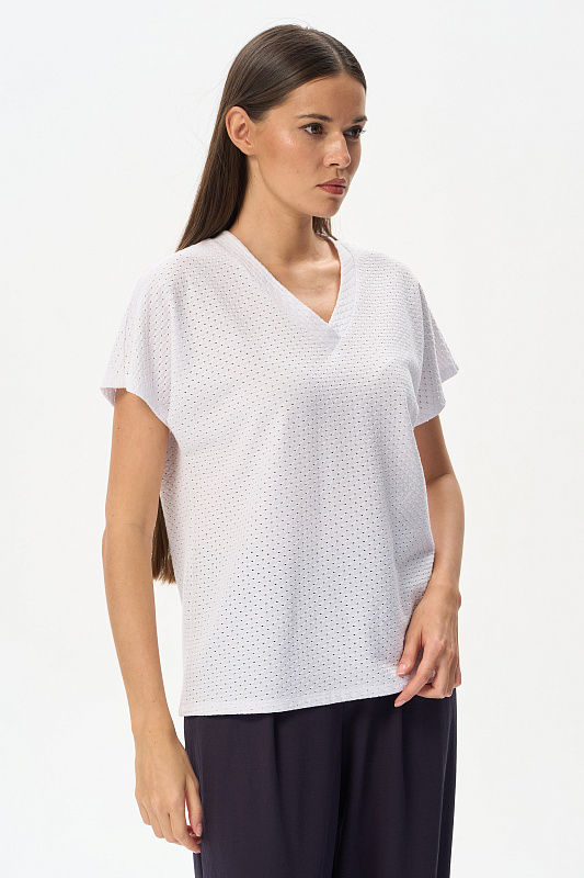Свободная футболка из фактурного хлопкового трикотажа в чистом белом оттенке. Красивый V-образный вырез горловины оформлен планкой, короткие цельнокроеные рукава. Лёгкая, приятная, эффектная модель для лета, благодаря трендовой фактуре образ будет выглядеть нарядным. Рост модели 175 см.
