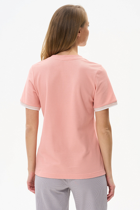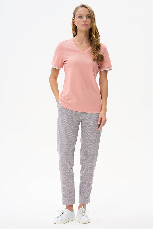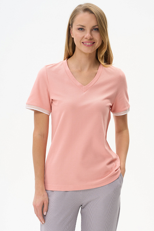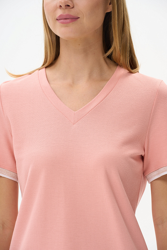 Футболка выполнена из хлопкового полотна - пике. V-образный вырез горловины, короткие рукава. Рост модели на фото 177см