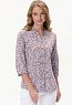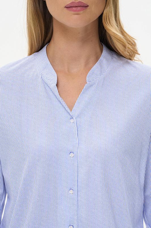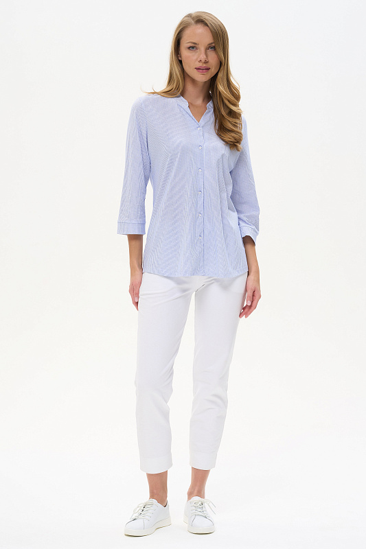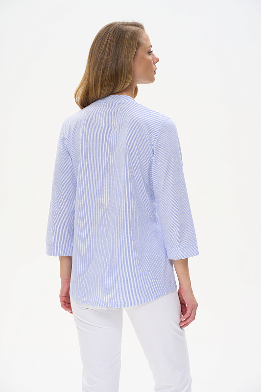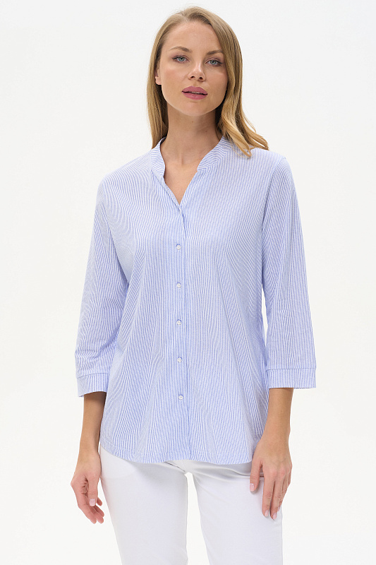 Блузка из кулирки качества ПЕ 150 гр. Вертикальные прерывистые полоски в оттенках Яркий синий и Чистый белый. Модель прямого силуэта воротник стойка, фигурная планка с застежкой на пуговицы. Втачные рукава длиной 7/8 с планкой по низу. Универсальная комфортная модель проверенная временем. Рост модели 175 см.