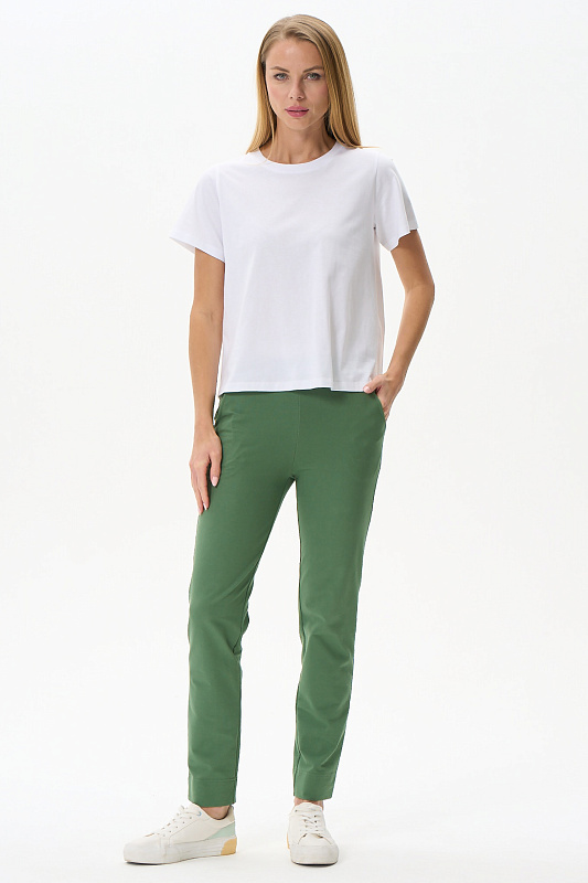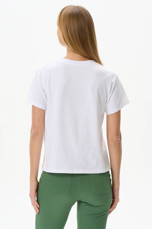 Футболка модного кроя - свободная и чуть укороченная. Выполнена из хлопкового трикотажного полотна с эластаном. Свободный втачной рукав гармонизирует общий стиль. Рост модели на фото 175 см