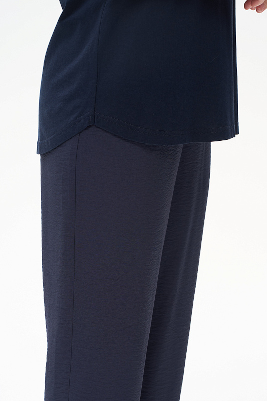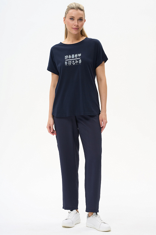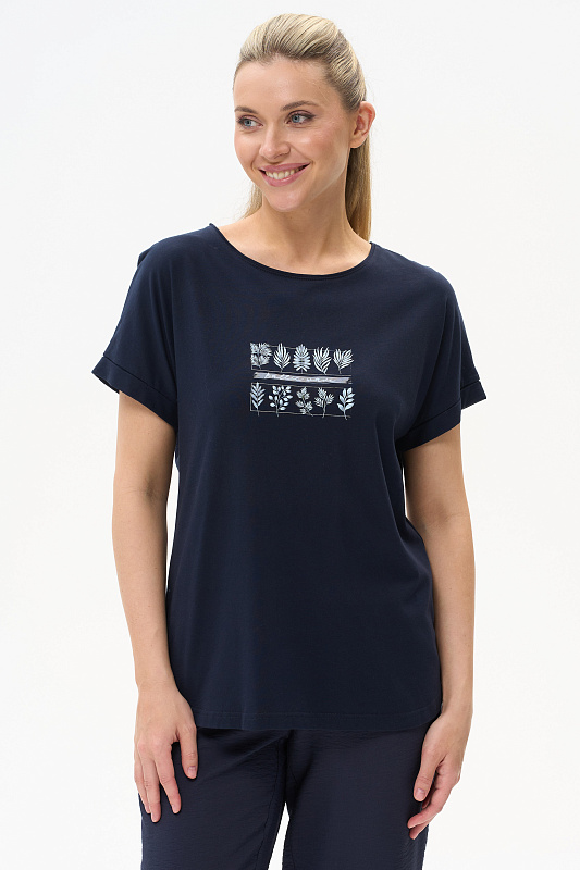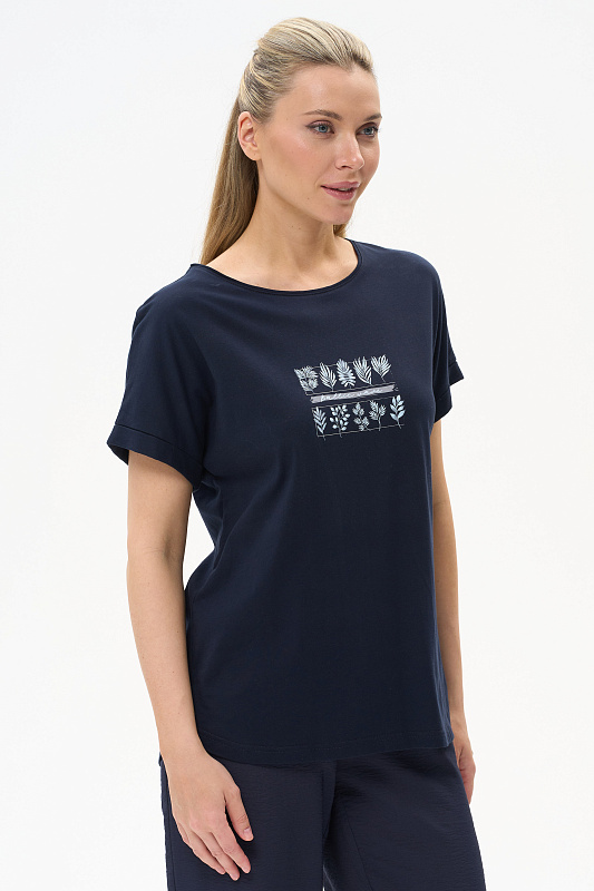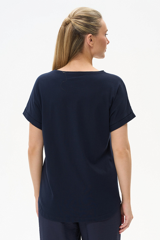 Футболка из хлопкового полотна. Круглый вырез горловины, цельнокроеные короткие рукава с отворотами, фигурная линия низа. Рост модели 175.