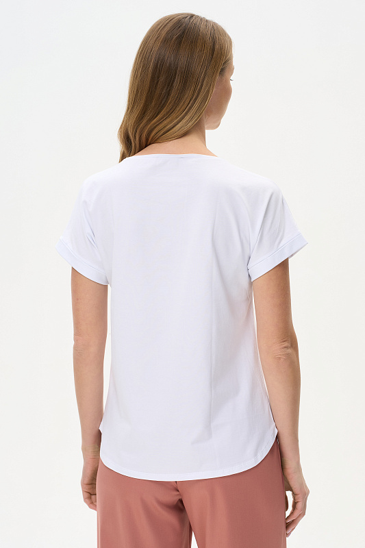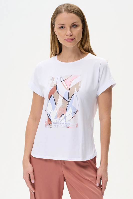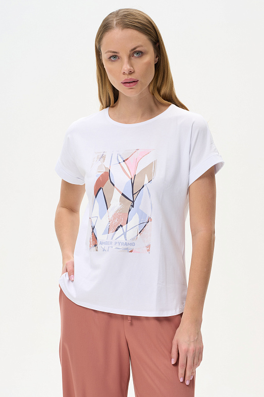 Футболка с принтом из хлопкового полотна с эластаном. Круглый вырез горловины, цельнокроеные короткие рукава с отворотами, фигурная линия низа. Рост модели на фото 178см.