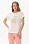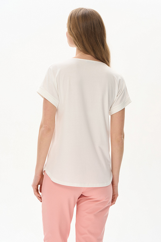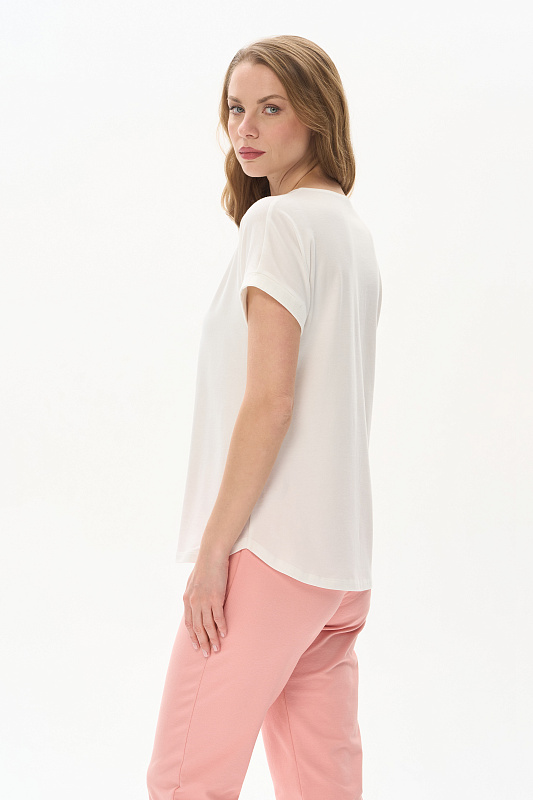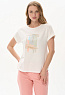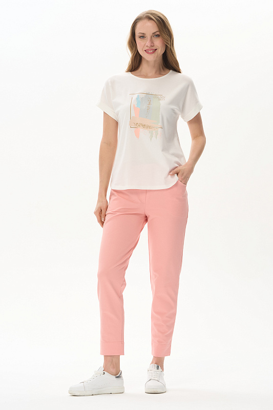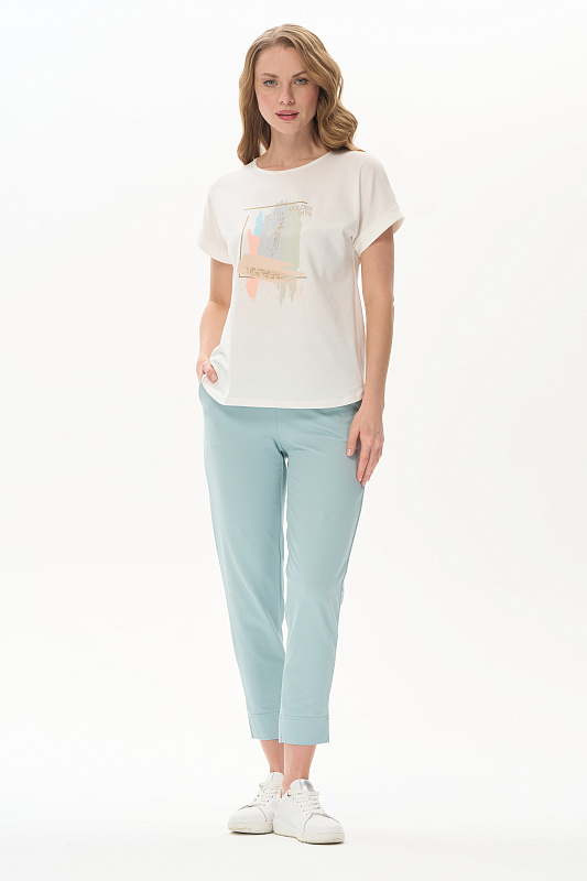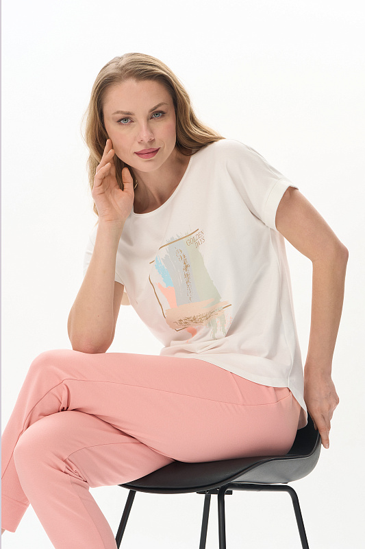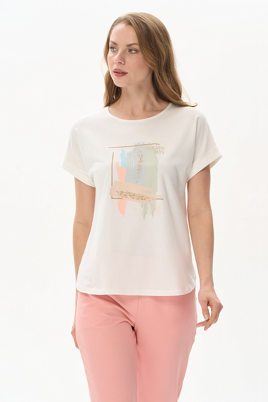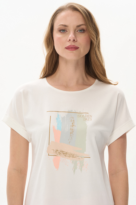 Футболка из кулирки с эластаном качества ПЕ 165 гр.в молочном оттенке. Модель с круглым вырезом горловины, цельнокроеными короткими рукавами с зафиксированным подворотом, фигурная линия низа. Принт - Абстрактный дизайн в живописном стиле. Благодаря такой печати модель выглядит ярко и привлекательно и сделает ваш образ эффектным. Рост модели 175 см.