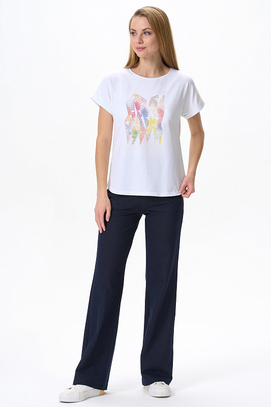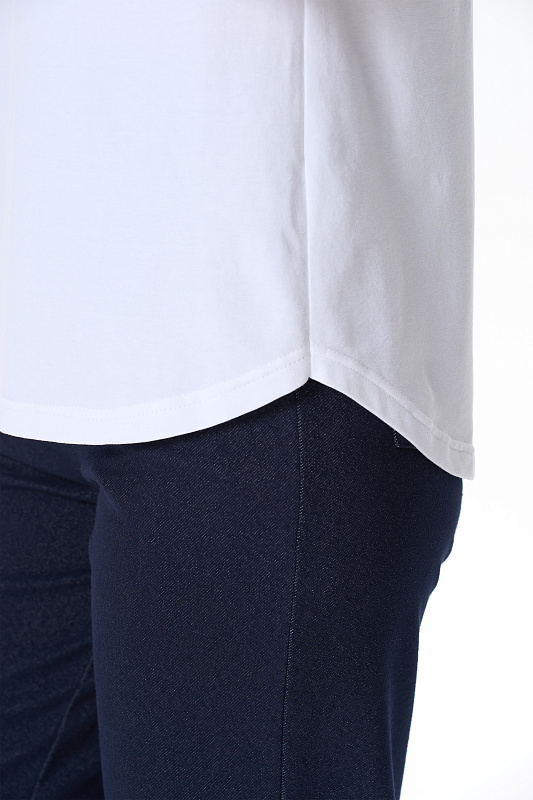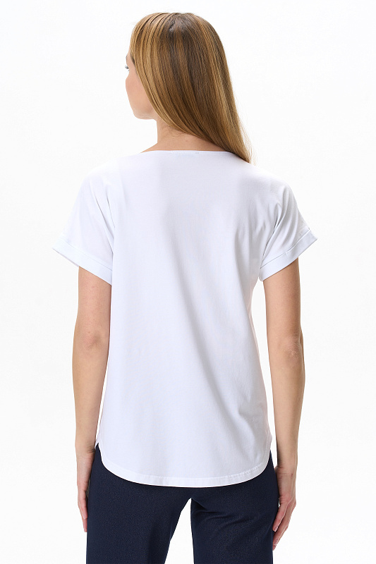 Футболка с принтом из хлопкового полотна с эластаном. Круглый вырез горловины, цельнокроеные короткие рукава с отворотами, фигурная линия низа. Рост модели на фото 178см.