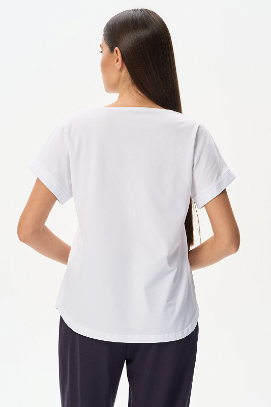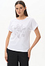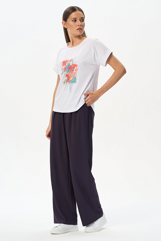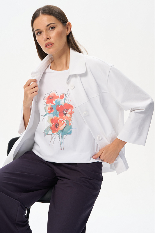 Белая футболка из кулирки с эластаном качества ПЕ 165 гр. Модель с круглым вырезом горловины, цельнокроеными короткими рукавами с зафиксированным подворотом, фигурная линия низа. Принт - прекрасные красные маки. Благодаря такой печати модель выглядит особенно ярко и эффектно и сделает ваш образ нарядным. Рост модели 175 см.