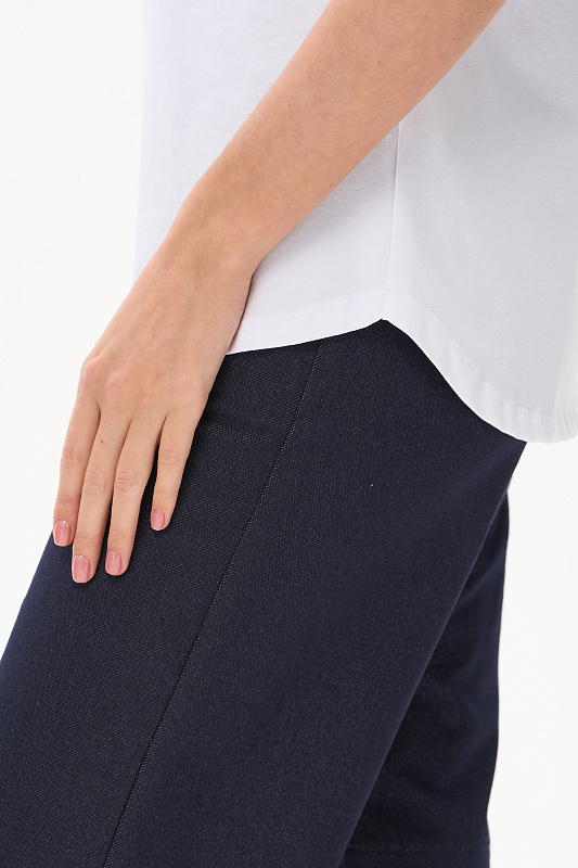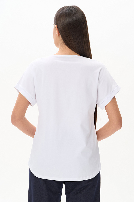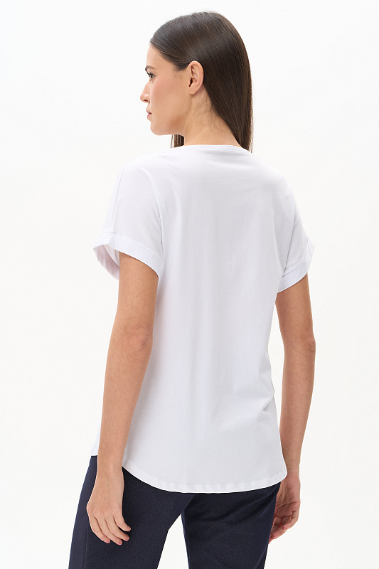 Футболка из хлопкового полотна с эластаном. Круглый вырез горловины, цельнокроеные короткие рукава с отворотами, фигурная линия низа. Рост модели на фото 175 см.