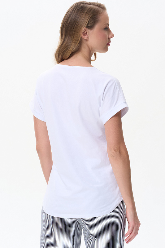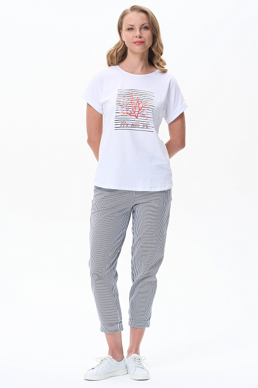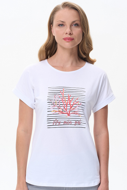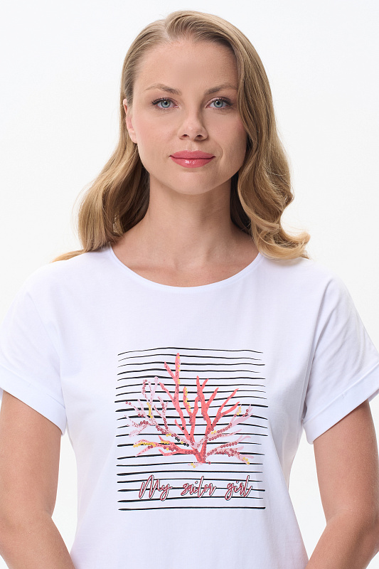 Белая футболка из кулирки с эластаном качества ПЕ 165 гр. Модель с круглым вырезом горловины, цельнокроеными короткими рукавами с зафиксированным подворотом, фигурная линия низа. Принт - красные кораллы на полоске. Благодаря такой печати модель выглядит ярко и привлекательно и сделает ваш образ эффектным. Рост модели 175 см.