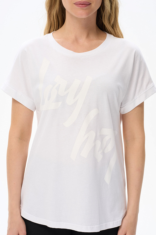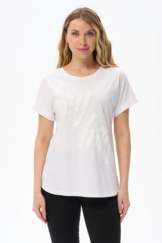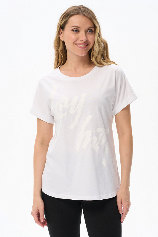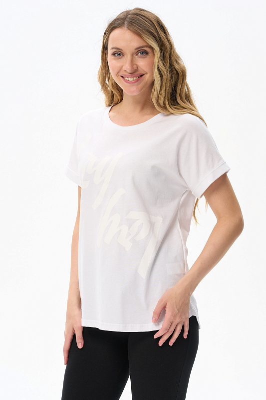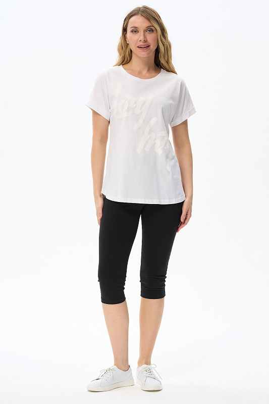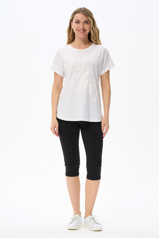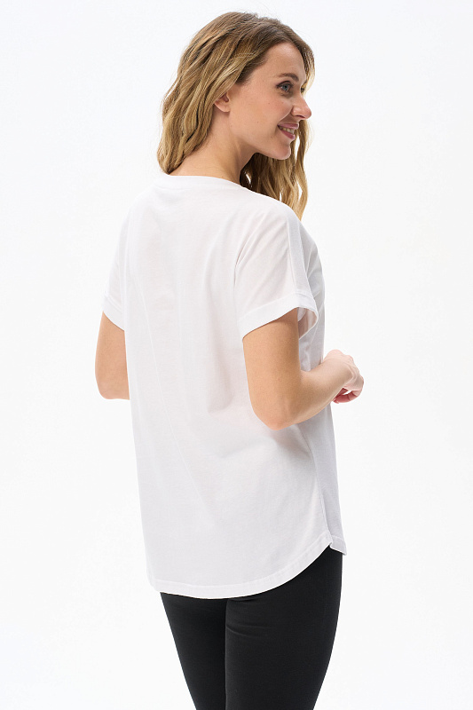 Футболка из хлопкового полотна с эластаном. Круглый вырез горловины, цельнокроеные короткие рукава с отворотами, фигурная линия низа. Рост модели на фото 175 см.