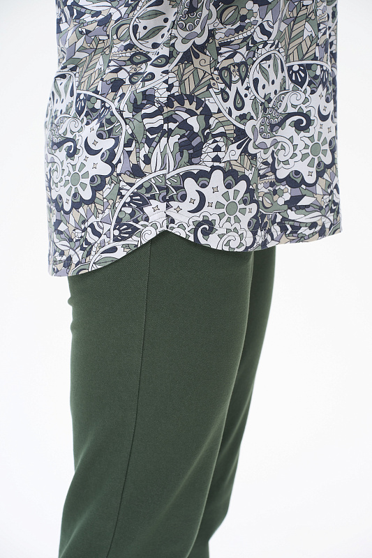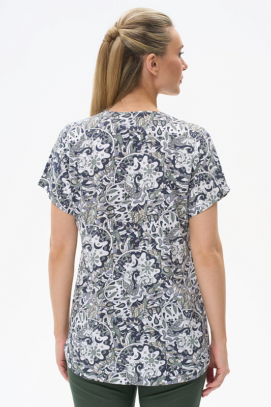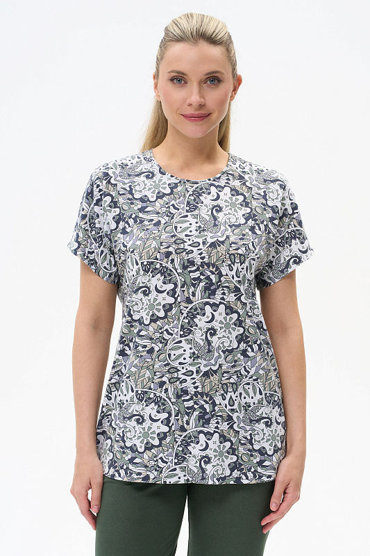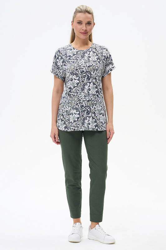 Футболка из хлопкового полотна. Круглый вырез горловины, оформлен отделочным кантом. Цельнокроенные короткие рукава, фигурная линия низа. Рост модели на фото 177см.