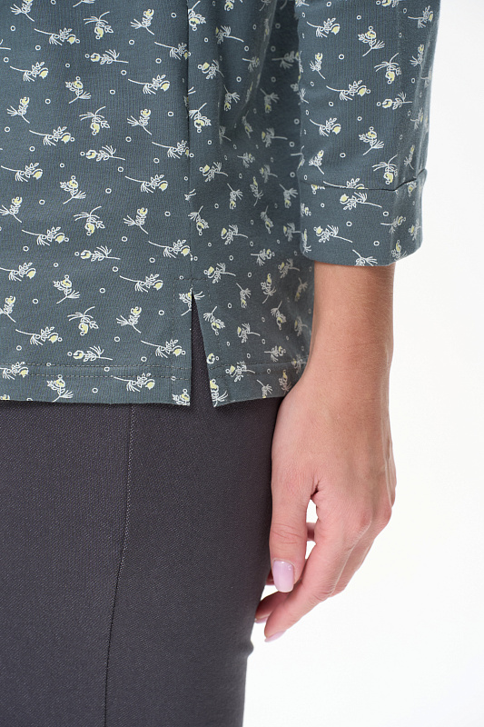 Блузка прямого силуэта из хлопкового трикотажного полотна. Отложной воротник, застежка на пуговицы. Укороченные втачные рукава с манжетами. Рост модели 175 см.