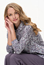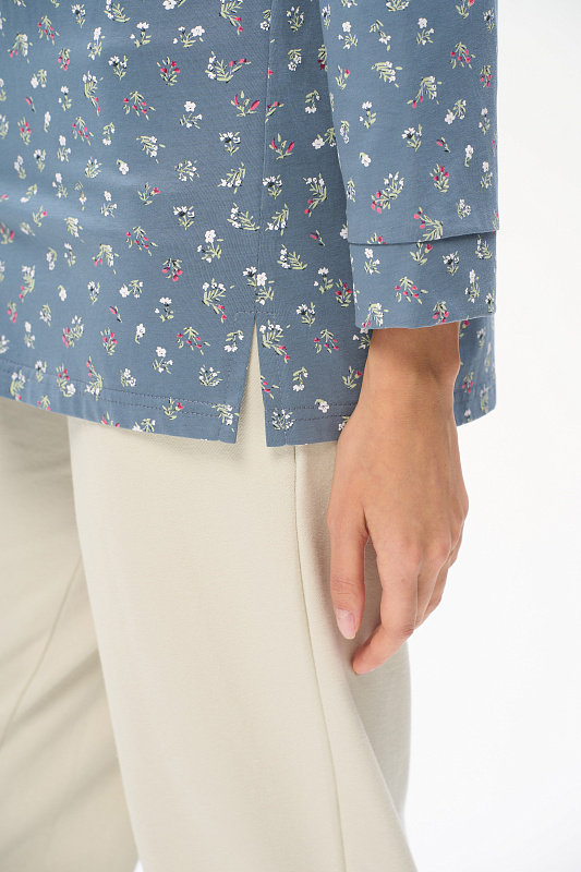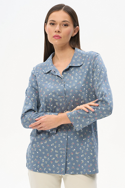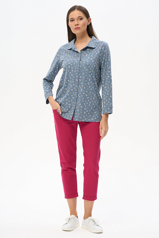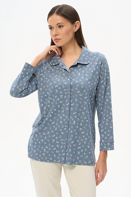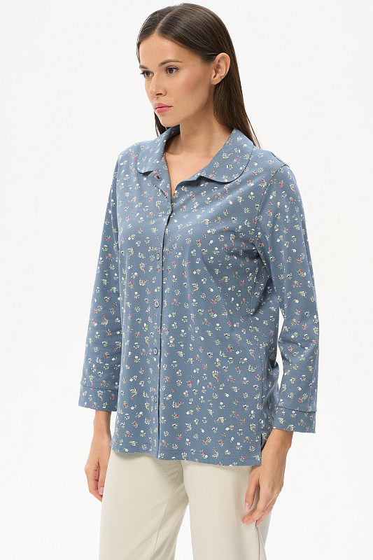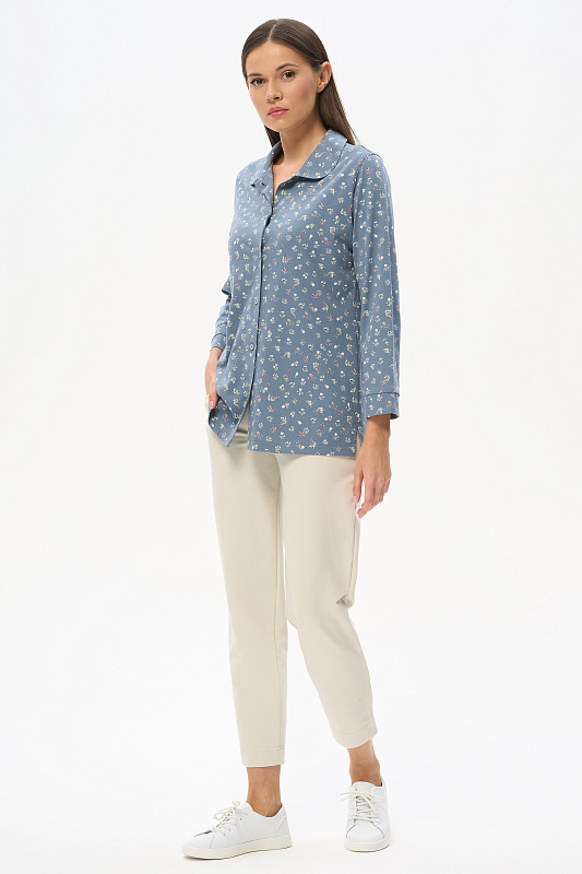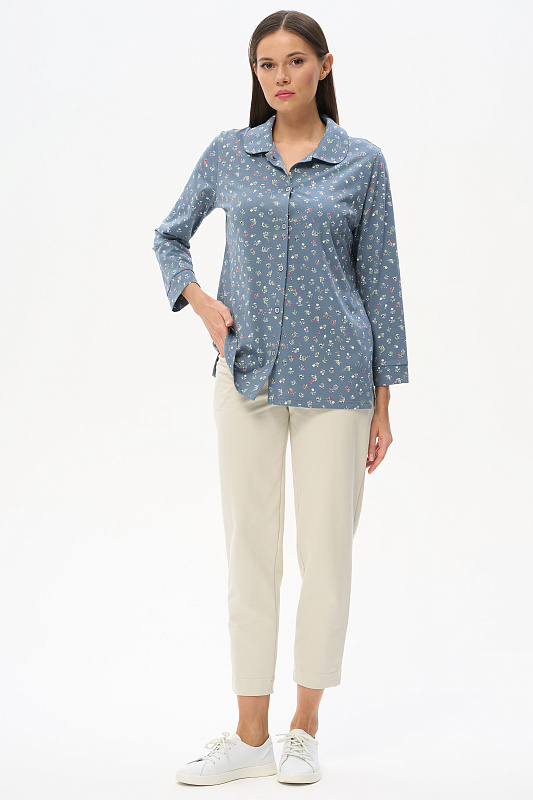 Блузка прямого силуэта из хлопкового трикотажного полотна. Отложной воротник, застежка на пуговицы. Укороченные втачные рукава с манжетами. Рост модели 175 см.
